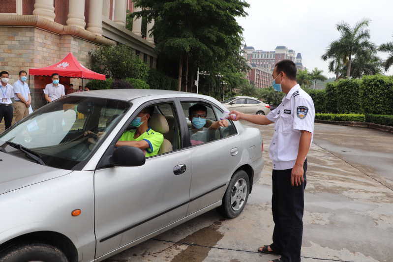 保安給自駕車返校的學(xué)生及家長檢測體溫