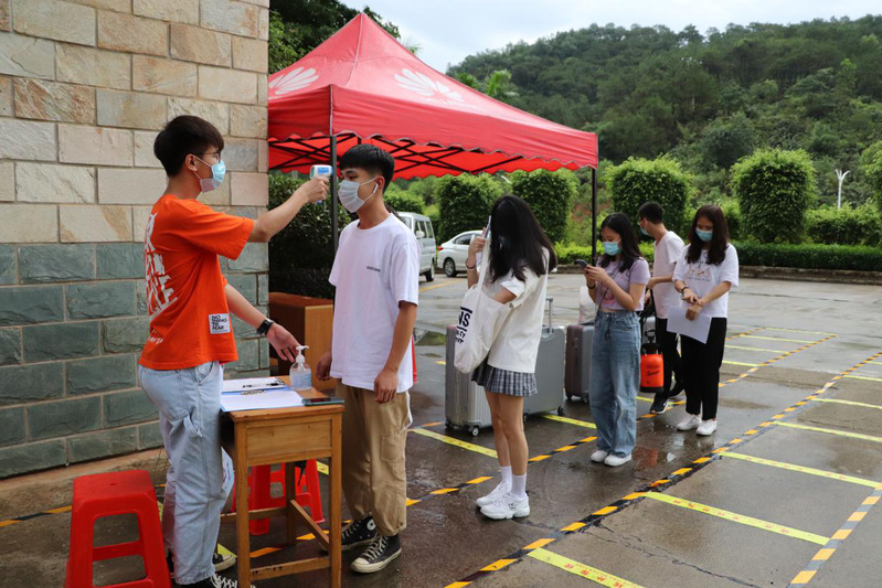 志愿者為返校同學檢測體溫和行李消毒