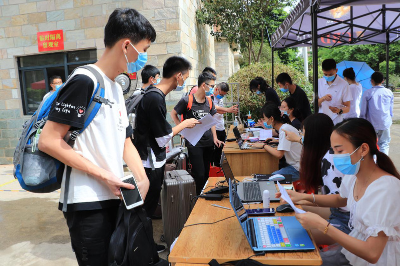 返?,F(xiàn)場,在教職工、學生志愿者指引下,同學們在校門口佩戴口罩、間隔排隊,依次經(jīng)過行李消毒、手部消毒和體溫檢測,查驗核酸檢測結(jié)果、健康管理告知書及14天體溫監(jiān)測表之后才能進入校園。