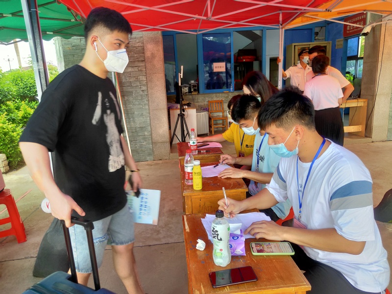 當天上午,學(xué)校的正大門早早搭起了帳篷,返校的學(xué)生入校需經(jīng)過各個關(guān)卡,通過檢測體溫、查驗葵花碼、查看移動軌跡,對行李和身體表面消毒,查驗學(xué)生身份和核對學(xué)生宿舍信息等多道程序,方能入校。