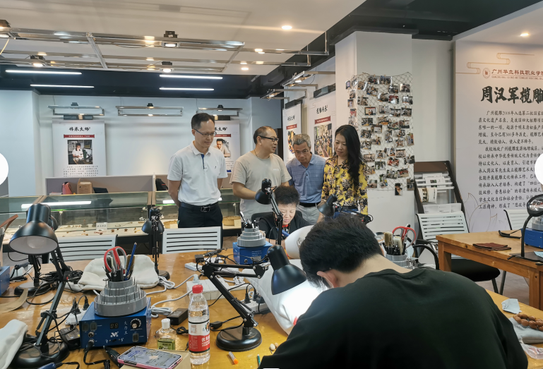 在欖雕基地,評建辦李艷華主任介紹了我?!皬V州欖雕”基地項目在2022年獲批廣東省高校第四批中華優(yōu)秀傳統(tǒng)文化傳承基地立項建設,基地在人才培養(yǎng)、課程建設和科研方面成果豐碩?!皬V州欖雕”代表性傳承人周漢軍大師介紹了工作室的情況,工作室自成立以來以欖雕技藝傳承為載體,將欖雕文化傳承融入人才培養(yǎng),已培養(yǎng)青年傳承骨干30余人,團隊設計開發(fā)欖雕文創(chuàng)作品100余件。湯麗玲主席對欖雕基地高度贊同,希望學校和周大師繼續(xù)將增城傳統(tǒng)文化發(fā)揚光大,讓更多人接觸這項技藝。