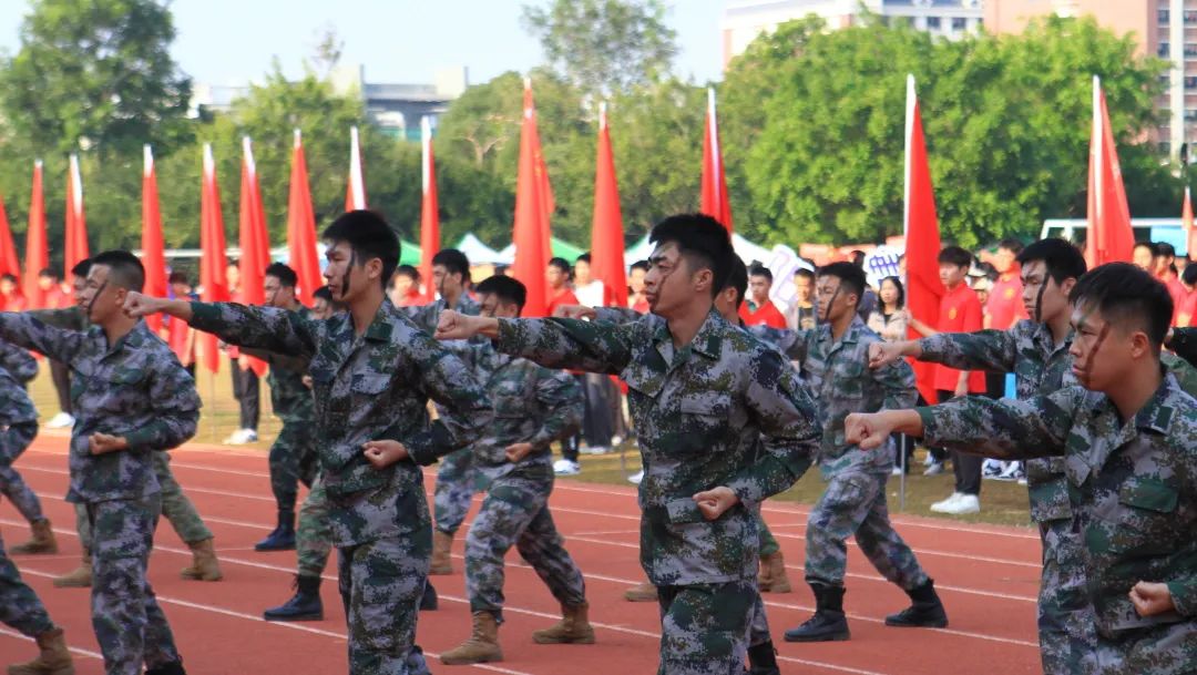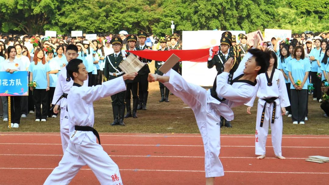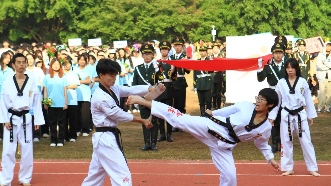 開(kāi)幕式上,國(guó)旗護(hù)衛(wèi)隊(duì)、鮮花方隊(duì)、紅旗方隊(duì)、機(jī)關(guān)教師代表隊(duì)、各二級(jí)學(xué)院師生代表隊(duì)、志愿者方隊(duì)和裁判員方隊(duì)伴隨著歡樂(lè)的音樂(lè)依次入場(chǎng)。虎虎生風(fēng)的旗幟、鏗鏘有力的步伐、響徹云霄的口號(hào),充分展現(xiàn)了全校師生自強(qiáng)自信、拼搏奮進(jìn)、團(tuán)結(jié)向上、樂(lè)觀積極的精神風(fēng)貌。最后,國(guó)防教育協(xié)會(huì)、跆拳道協(xié)會(huì)、街舞協(xié)會(huì)的精彩表演將開(kāi)幕式推向了高潮。