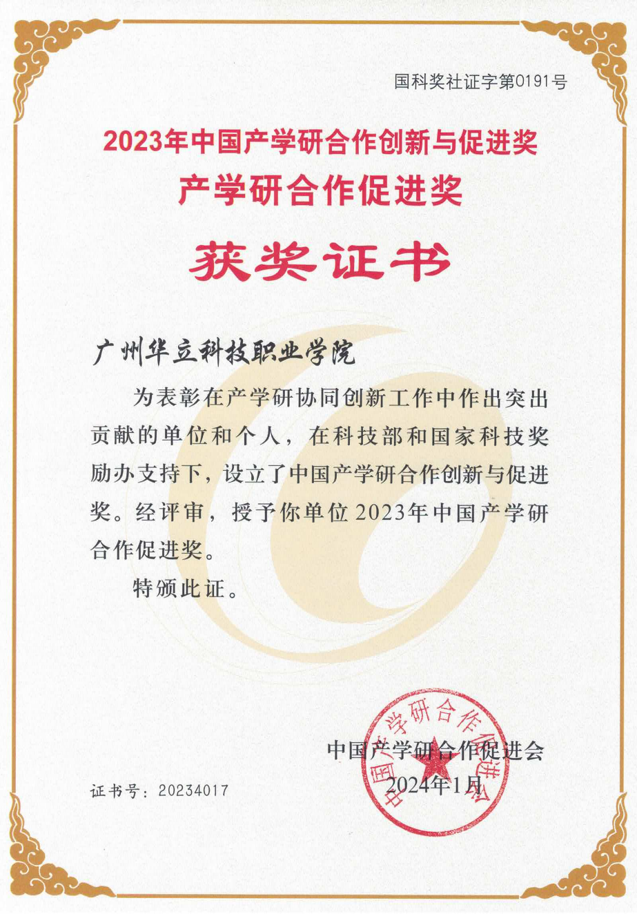 中國(guó)產(chǎn)學(xué)研合作創(chuàng)新與促進(jìn)獎(jiǎng)是經(jīng)科技部和國(guó)家科技獎(jiǎng)勵(lì)工作辦公室批準(zhǔn),由中國(guó)產(chǎn)學(xué)研合作促進(jìn)會(huì)設(shè)立的在產(chǎn)學(xué)研合作方面的全國(guó)性獎(jiǎng)項(xiàng), 也是中國(guó)產(chǎn)學(xué)研協(xié)同創(chuàng)新領(lǐng)域的最高榮譽(yù)獎(jiǎng),以表彰在推進(jìn)“政產(chǎn)學(xué)研金服用”深度融合中做出突出貢獻(xiàn)的先進(jìn)單位及個(gè)人。大會(huì)授予廣州華立科技職業(yè)學(xué)院“中國(guó)產(chǎn)學(xué)研合作促進(jìn)獎(jiǎng)”單位。