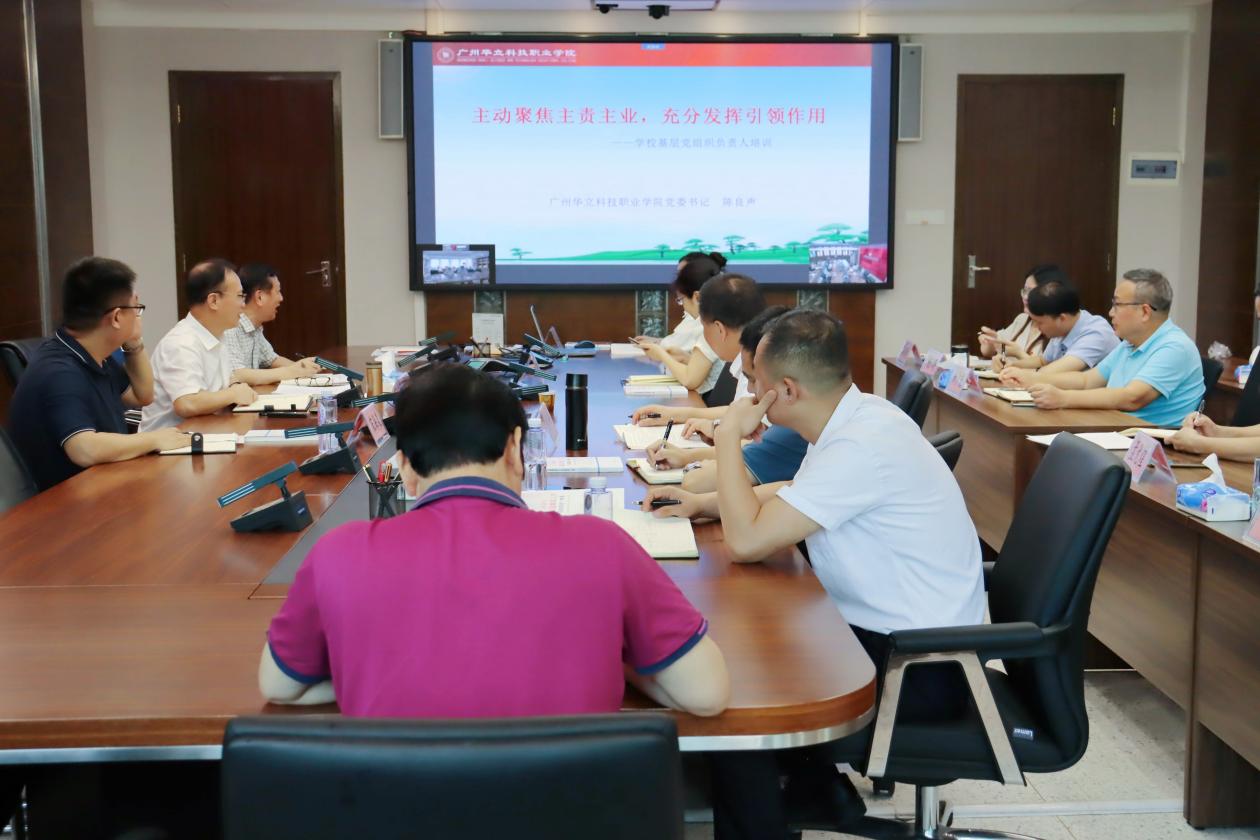 廣州華立科技職業(yè)學院于3月底順利完成了全?;鶎狱h組織的換屆工作,為了進一步加強基層黨組織建設(shè),提升新一屆基層黨組織負責人的政治能力和黨務水平,4月17日上午,學校黨委書記陳良聲與全校新一屆基層黨組織負責人開展集體談話,并作了題為《主動聚焦主責主業(yè),充分發(fā)揮引領(lǐng)作用》的業(yè)務培訓報告,云浮校區(qū)以連線方式參加,黨委委員、組織部部長劉宇赤同志主持集體談話活動和培訓會議。