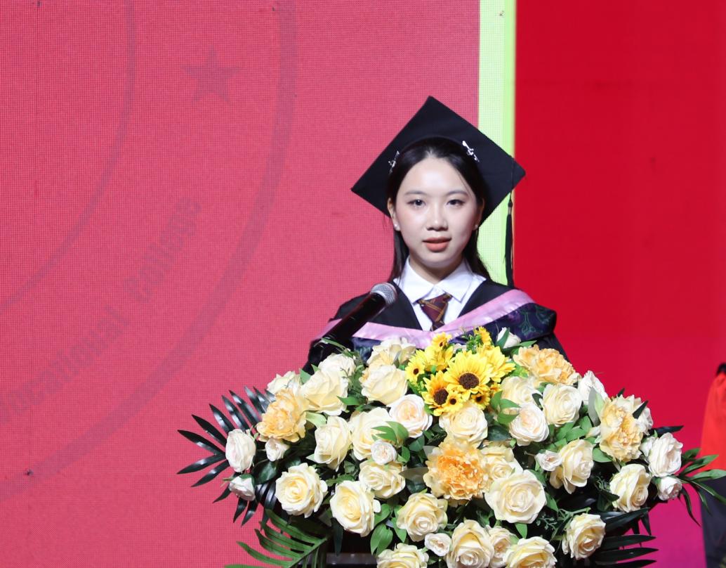 經(jīng)管學(xué)院的黃瑩瑩同學(xué)代表2024屆全體畢業(yè)生進(jìn)行發(fā)言,對(duì)關(guān)切師生的領(lǐng)導(dǎo),和認(rèn)真教學(xué)、辛勤教課的所有老師們,表示了衷心的感謝和崇高的敬意!表示自己一定會(huì)努力成為有理想、有道德、有文化、守紀(jì)律的合格畢業(yè)生,給社會(huì)、給學(xué)校、給家人交一份滿意的答卷。最后,送上了誠摯的祝福,衷心祝愿母校蓬勃發(fā)展,再譜華章,祝愿老師們碩果累累、桃李滿園,祝愿同學(xué)們一帆風(fēng)順,前程似錦!