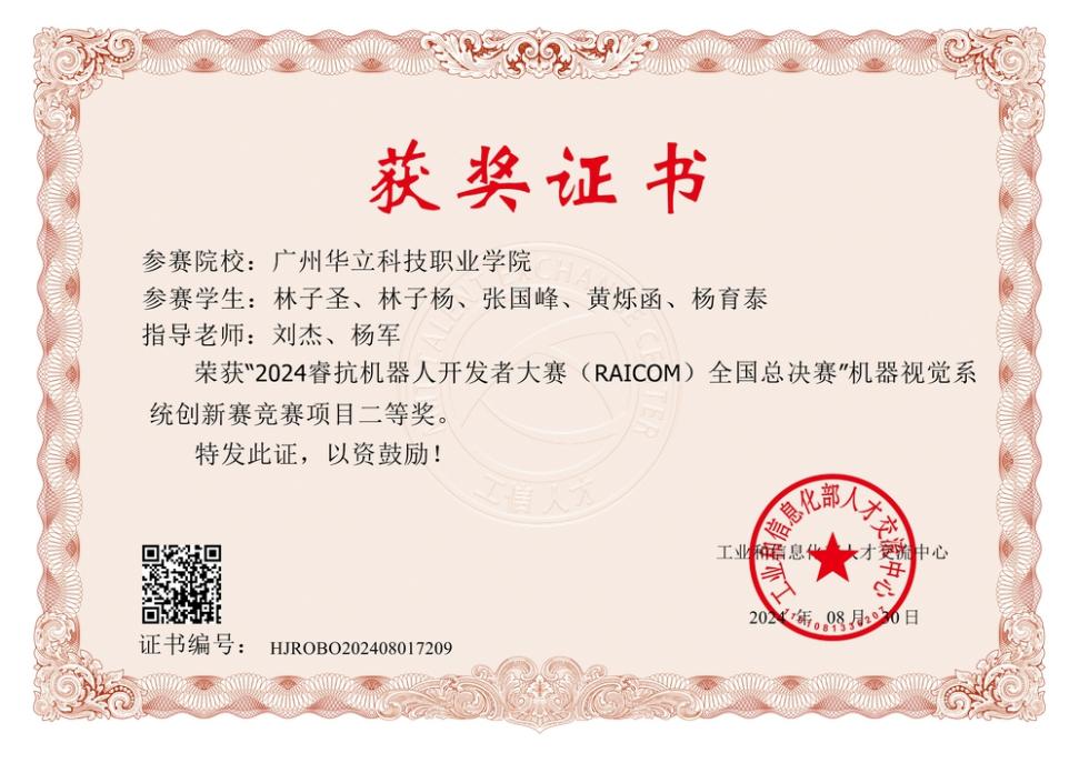 2024年8月20日-22日,2024睿抗機(jī)器人開發(fā)者大賽全國總決賽-CAIM機(jī)器視覺系統(tǒng)創(chuàng)新賽在杭州市余杭區(qū)中國人工智能小鎮(zhèn)舉行。我院學(xué)生林子圣、林子楊、張國峰、黃爍函、楊育泰在指導(dǎo)教師劉杰的帶領(lǐng)下,與來自全國34個省市的108支代表隊(duì)、同場地競技,角逐一、二、三等獎。經(jīng)過緊張激烈的比賽,我院學(xué)生奪得該項(xiàng)目高職組二等獎,可喜可賀。