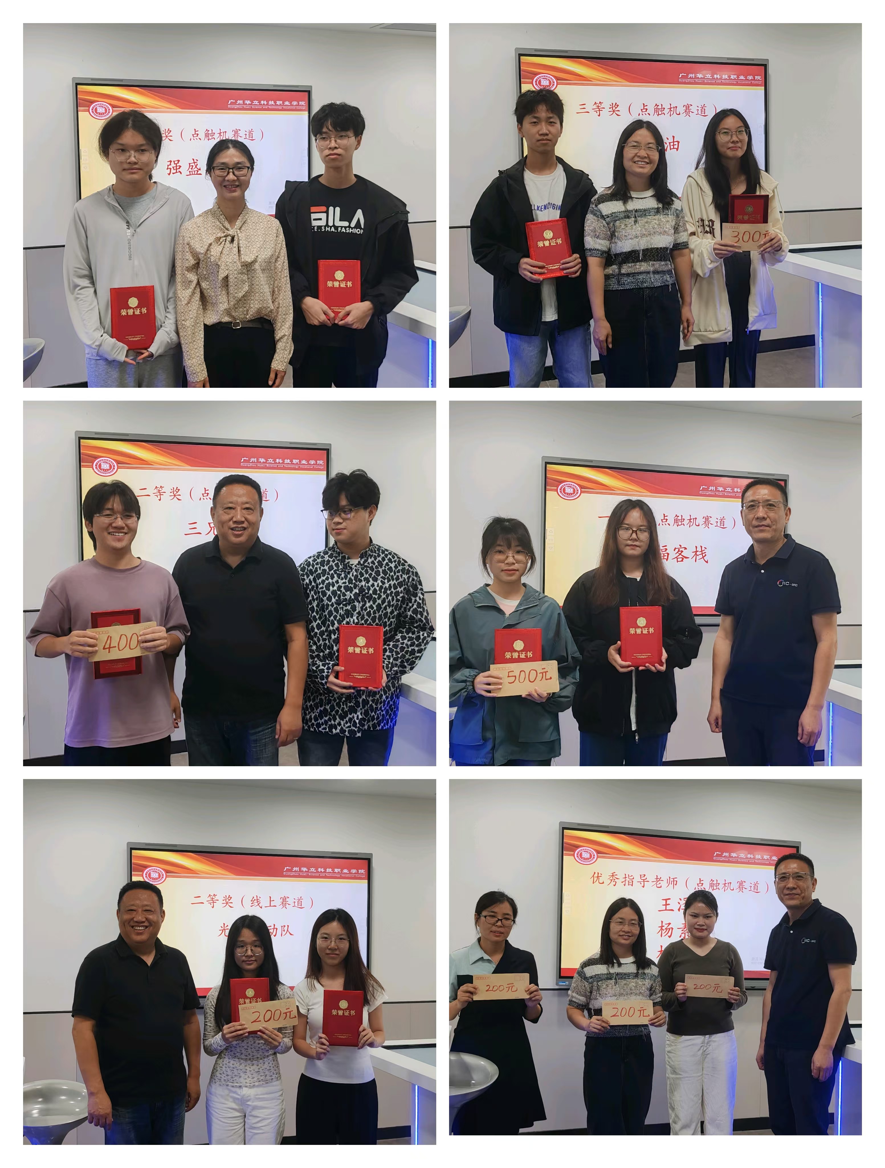 比賽結(jié)束后,增城校區(qū)和云浮校區(qū)分別舉行了隆重的頒獎典禮。廣州華立科技職業(yè)學(xué)院實訓(xùn)中心主任張磊、教務(wù)處副處長曾英姿、經(jīng)濟管理學(xué)院副院長梁慧貞等領(lǐng)導(dǎo),以及上海奕教科技有限公司華南區(qū)域負責(zé)人張勇等嘉賓出席了增城校區(qū)的頒獎典禮,并為獲獎團隊和個人頒獎。同時,經(jīng)濟管理學(xué)院副院長劉軍根、校辦副主任林子云、教務(wù)處教務(wù)與教材科副科長何勝華等領(lǐng)導(dǎo)也出席了云浮校區(qū)的頒獎典禮,并為獲獎團隊和個人頒獎。