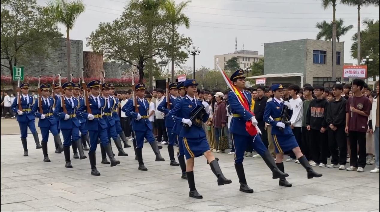 旗手們恰似挺拔的白楊,身姿筆挺,邁著整齊劃一、擲地有聲的正步,護(hù)送著五星紅旗走向升旗臺(tái)。