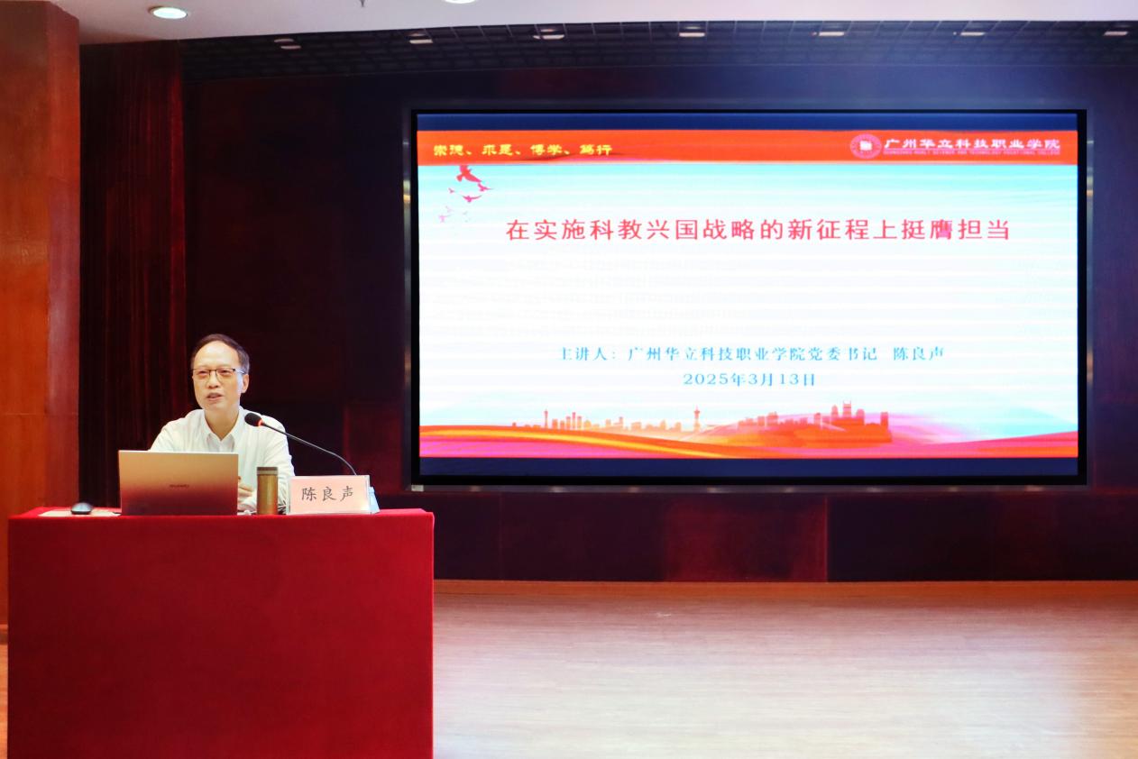 為深入學(xué)習(xí)貫徹黨的二十大和二十屆三中全會(huì)精神,貫徹落實(shí)全省教育大會(huì)精神,2025年3月13日晚,學(xué)校黨委書記陳良聲在圖書館一號(hào)報(bào)告廳為藝術(shù)與傳媒學(xué)院300多名師生代表講授題為“在實(shí)施科教興國(guó)戰(zhàn)略的新征程上挺膺擔(dān)當(dāng)”的專題黨課。黨課由藝術(shù)與傳媒學(xué)院黨總支書記陳改梅主持,學(xué)校辦公室、黨委辦公室、藝術(shù)與傳媒學(xué)院黨員代表參加學(xué)習(xí)。