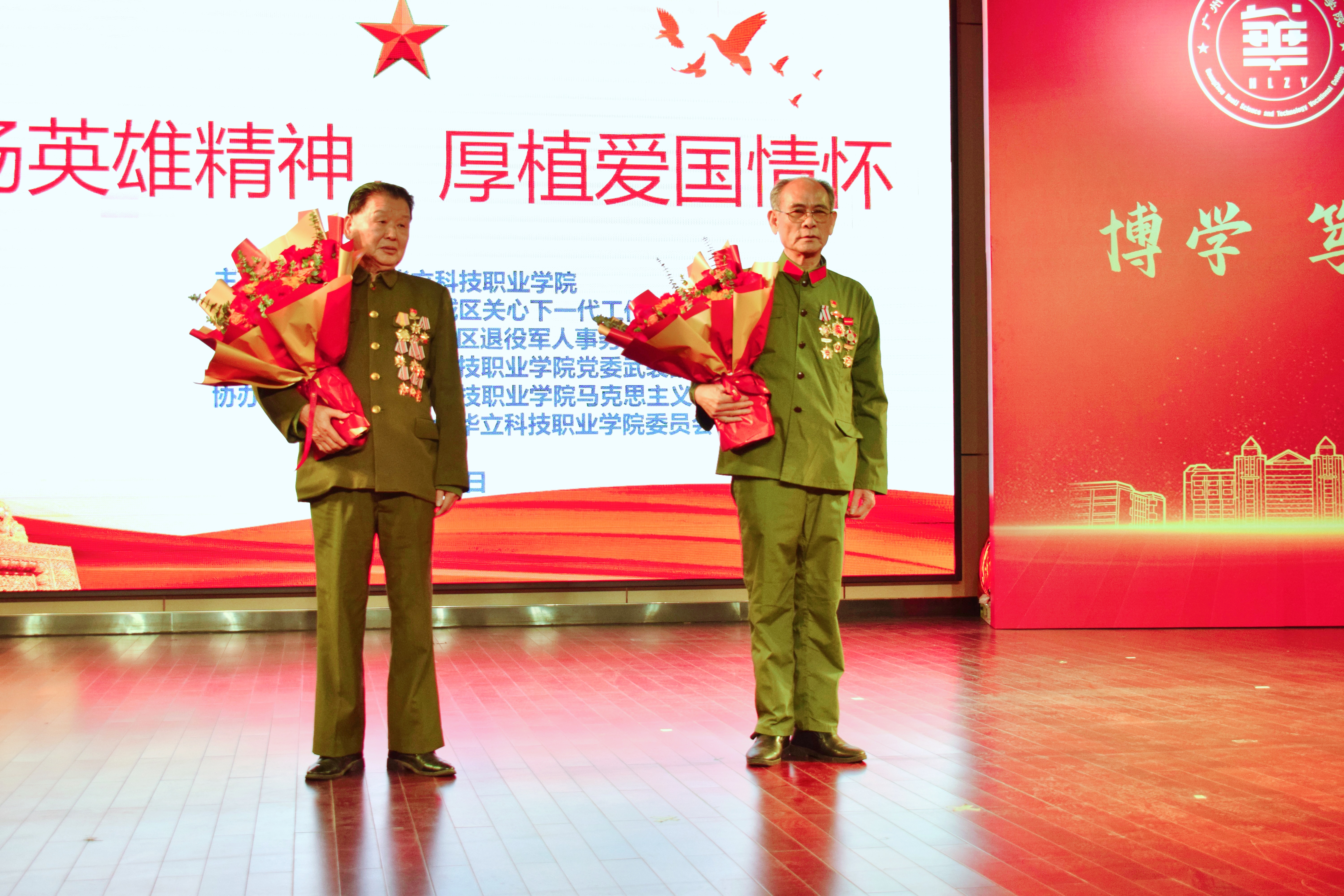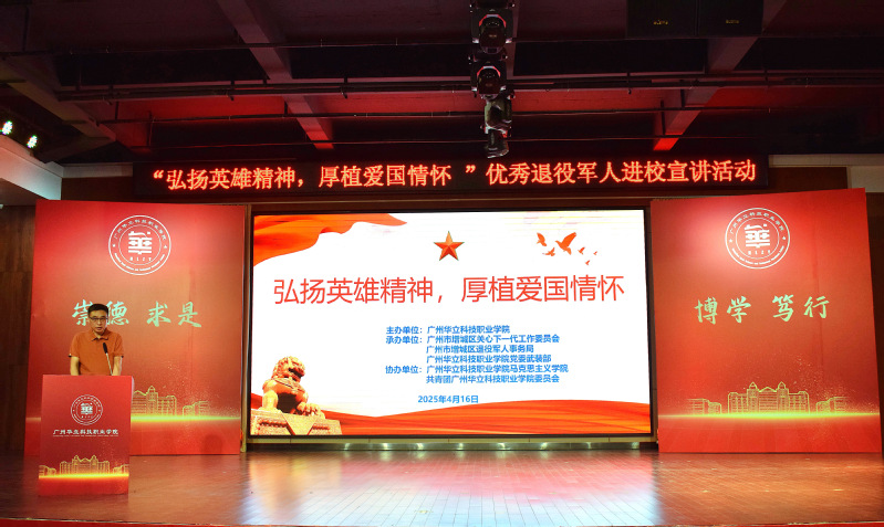 4月16日下午,我校在圖書(shū)館8樓報(bào)告廳舉辦了“弘揚(yáng)英雄精神,厚植愛(ài)國(guó)情懷”優(yōu)秀退役軍人進(jìn)校宣講活動(dòng)。此次活動(dòng)由廣州華立科技職業(yè)學(xué)院主辦、廣州市增城區(qū)關(guān)心下一代工作委員會(huì)、廣州市增城區(qū)退役軍人事務(wù)局與廣州華立科技職業(yè)學(xué)院武裝部聯(lián)合承辦,廣州華立科技職業(yè)學(xué)院黨委副書(shū)記、副校長(zhǎng)王洪艷、黨委武裝部部長(zhǎng)陳勝軍、馬克思主義學(xué)院院長(zhǎng)廖良初、團(tuán)委書(shū)記張超越、廣州市增城區(qū)退役軍人事務(wù)局服務(wù)中心主任顧翎、廣州市增城區(qū)退役軍人事務(wù)局九級(jí)職員陳艷、廣州市增城區(qū)增江街退役軍人服務(wù)站工作人員陳子晴、廣州松田職業(yè)學(xué)院黨委武裝部副部長(zhǎng)曹文豪以及來(lái)自增城區(qū)的兩位優(yōu)秀退役軍人代表、學(xué)校各二級(jí)學(xué)院學(xué)管主任等領(lǐng)導(dǎo)和嘉賓出席了活動(dòng)?;顒?dòng)在莊嚴(yán)的國(guó)歌中拉開(kāi)序幕,學(xué)校國(guó)旗護(hù)衛(wèi)隊(duì)隊(duì)員護(hù)送國(guó)旗入場(chǎng)。
