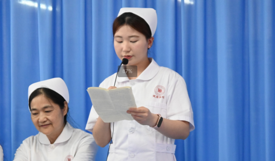 開幕式上,護(hù)理專業(yè)學(xué)生肖佳妍身著圣潔護(hù)士服,作為學(xué)生代表講話,她說(shuō):“護(hù)理,是生命的守護(hù)者,是健康的護(hù)航者。南丁格爾提燈照亮戰(zhàn)場(chǎng)的身影,不僅溫暖了傷員的心靈,更照亮了護(hù)理事業(yè)的發(fā)展之路。在學(xué)校的課堂上,我們學(xué)習(xí)南丁格爾誓言;在實(shí)訓(xùn)室里,我們反復(fù)練習(xí)每一項(xiàng)護(hù)理操作;在醫(yī)院的見(jiàn)習(xí)過(guò)程中,我們見(jiàn)證著護(hù)理前輩們用專業(yè)和愛(ài)心托起生命的希望。每一個(gè)步驟的規(guī)范操作、每一次與患者的耐心溝通,都讓我們深刻理解‘健康所系,性命相托’的分量。親愛(ài)的同學(xué)們,我們選擇護(hù)理專業(yè),就是選擇了一份沉甸甸的責(zé)任。當(dāng)我們穿上潔白的護(hù)士服,戴上象征使命的燕尾帽,就意味著要將患者的健康放在首位。