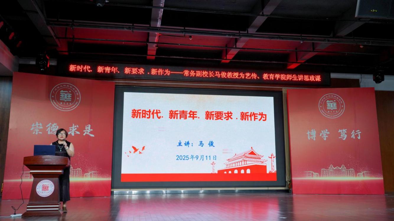 秋意漸濃啟新程,思想領(lǐng)航聚力量。 9 月 11 日晚 6 點(diǎn),學(xué)校常務(wù)副校長(zhǎng)馬俊教授以“新時(shí)代、新青年、新要求、新作為”為主題,在圖書(shū)館八樓報(bào)告廳為藝術(shù)與傳媒學(xué)院、教育學(xué)院的700名師生代表們講授了“思政第一課”。馬俊教授用深刻的理論闡釋、鮮活的實(shí)踐案例,為在場(chǎng)師生打造了一堂兼具思想深度與情感溫度的思政課。