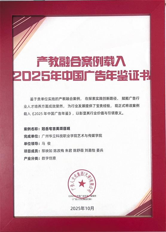 此次研討會(huì)是華立職院在藝術(shù)設(shè)計(jì)教育創(chuàng)新和產(chǎn)教融合方面邁出的重要一步。經(jīng)全國(guó)輕工藝術(shù)設(shè)計(jì)專業(yè)委員會(huì)和共同體專家評(píng)審:由馬俊 、肖釗俊、沈泓睿、王渡讀團(tuán)隊(duì)制作的紀(jì)錄片榮獲中國(guó)大學(xué)生廣告藝術(shù)學(xué)院獎(jiǎng) 2025年“筑夢(mèng)產(chǎn)教·校長(zhǎng)印記”賽項(xiàng)“金獎(jiǎng)”;華立職院產(chǎn)教融合案例“植根基層、融通藝工、淬煉實(shí)戰(zhàn):高職藝術(shù)設(shè)計(jì)產(chǎn)教融合育人新模式的探索與實(shí)踐”榮獲“產(chǎn)教融合典型案例”;華立職院藝術(shù)與傳媒學(xué)院黨總支書記陳改梅、就業(yè)主任黎映如獲聘“全國(guó)輕工藝術(shù)設(shè)計(jì)專委會(huì)智庫(kù)專家”;華立職院“冠岳宅吉美項(xiàng)目班”產(chǎn)教融合案例,正式載入《2025年中國(guó)廣告年鑒》,以彰顯其行業(yè)價(jià)值與引領(lǐng)意義;學(xué)校獲評(píng)創(chuàng)意星大學(xué)生實(shí)踐人才培育工程-廣州華立科技職業(yè)學(xué)院網(wǎng)易傳媒新媒體人才孵化計(jì)劃實(shí)訓(xùn)單位。