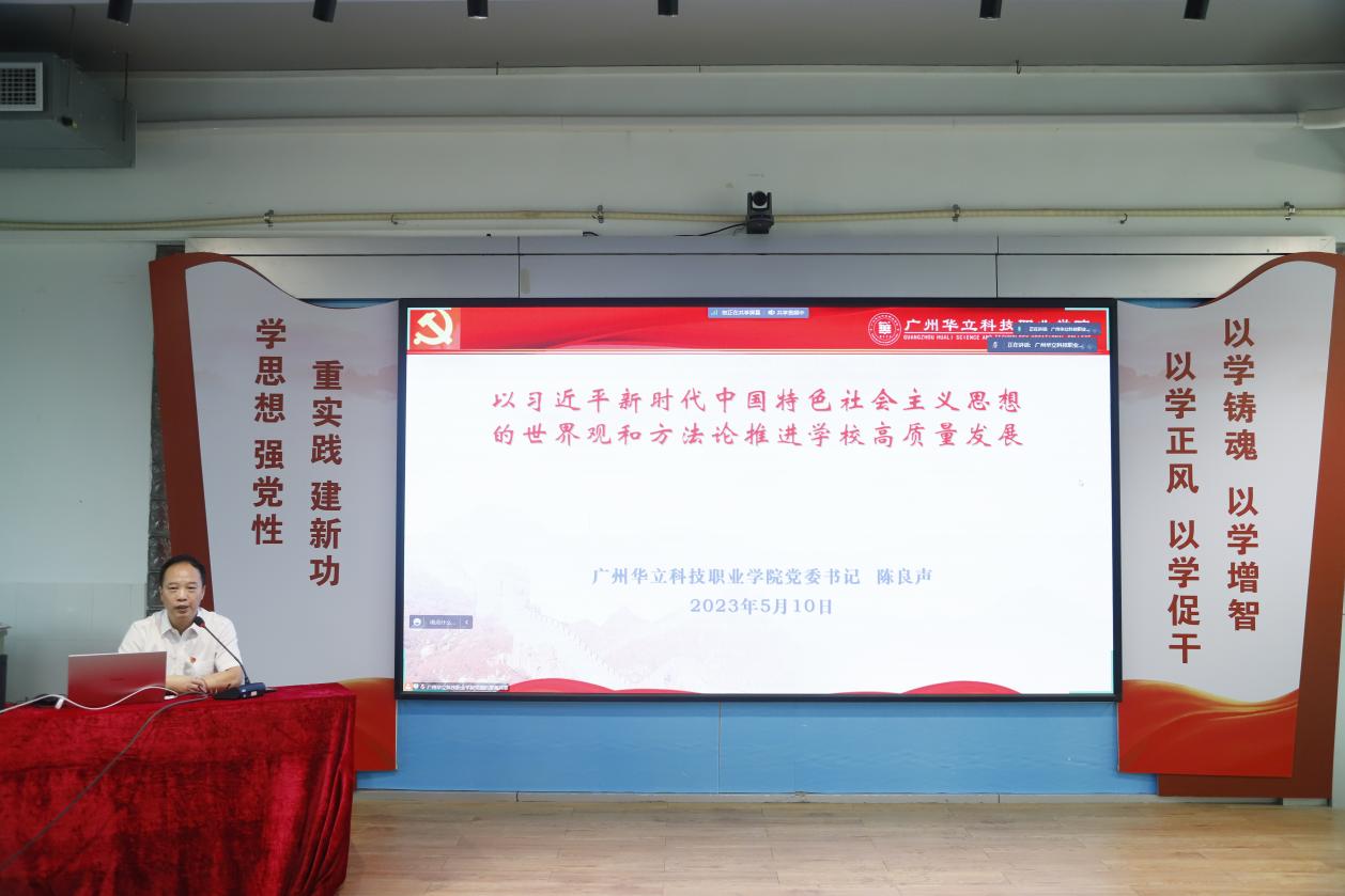 陳良聲指出,用習(xí)近平新時代中國特色社會主義思想的世界觀和方法論推動學(xué)校高質(zhì)量發(fā)展:一是堅持人民至上,要視生如子,堅持以師生為本,堅持人的全面發(fā)展,堅持立德樹人、三全育人、授道解惑,聚焦學(xué)生成長成才,要及時解決師生急難愁盼問題,以個人發(fā)展推動學(xué)校發(fā)展、以學(xué)校發(fā)展支持個人發(fā)展;二是堅持自信自立,加強“黨建雙創(chuàng)”(高校黨建工作示范創(chuàng)建和質(zhì)量創(chuàng)優(yōu))、發(fā)力“雙高計劃”(中國特色高水平高職學(xué)校和專業(yè)建設(shè)計劃),努力開創(chuàng)學(xué)校發(fā)展新格局;三是堅持守正創(chuàng)新,結(jié)合學(xué)科特點,挖掘黨建亮點,發(fā)揮學(xué)?;鶎狱h組織戰(zhàn)斗堡壘作用和黨員先鋒模范作用,推進黨建工作和學(xué)校事業(yè)發(fā)展深度融合;四是堅持問題導(dǎo)向,不斷增強學(xué)校的生存力、競爭力、發(fā)展力、持續(xù)力;五是堅持系統(tǒng)觀念,堅持教育發(fā)展、科技創(chuàng)新、人才培養(yǎng)一體推進,堅持原始創(chuàng)新、集成創(chuàng)新、開放創(chuàng)新一體設(shè)計,堅持創(chuàng)新鏈、產(chǎn)業(yè)鏈、人才鏈一體部署。強化政治安全和意識形態(tài)安全,加強意識形態(tài)陣地管理,極力營造安全有序校園環(huán)境;六是堅持胸懷天下,要加強國際交流、校際交往、院際溝通、產(chǎn)教融合、科教融匯、校企合作,為建設(shè)新時代高質(zhì)量的職業(yè)教育協(xié)同發(fā)力。
