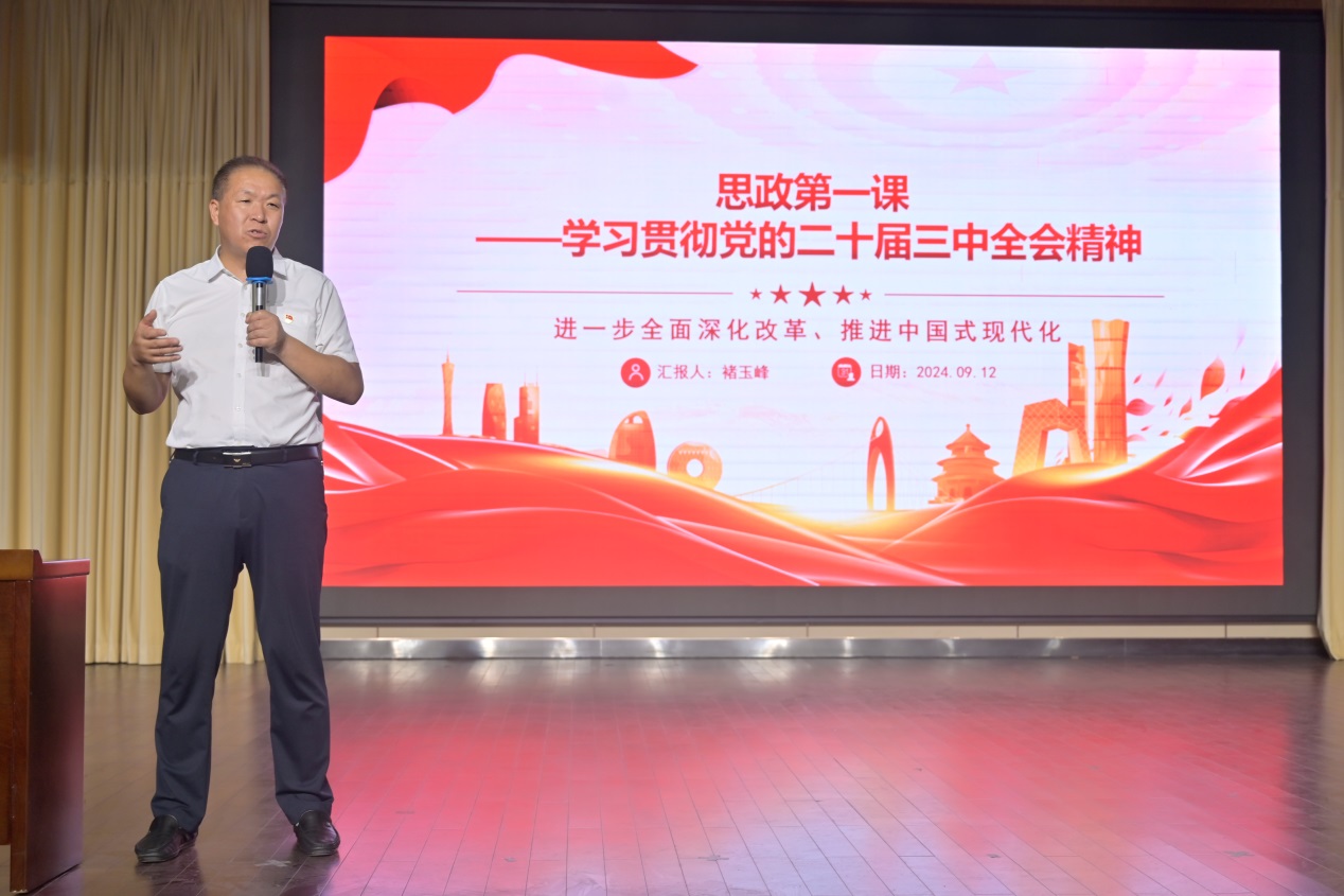學(xué)院黨總支書記褚玉峰的報(bào)告主要分為兩部分,第一部分是學(xué)習(xí)貫徹黨的二十屆三中全會(huì)精神,第二部分是習(xí)近平總書記對(duì)青年人寄語(yǔ)希望。他從“中國(guó)共產(chǎn)黨第二十屆中央委員會(huì)第三次全體會(huì)議”的基本概況開始講起,著重講述了新時(shí)代以來(lái)全面深化改革的成功實(shí)踐和偉大成就,進(jìn)一步全面深化改革的總目標(biāo),新時(shí)代全面深化改革的寶貴經(jīng)驗(yàn),高質(zhì)量發(fā)展是全面建設(shè)社會(huì)主義現(xiàn)代化國(guó)家的首要任務(wù),中國(guó)式現(xiàn)代化是走和平發(fā)展道路的現(xiàn)代化等內(nèi)容。當(dāng)他講到“教育、科技、人才是中國(guó)式現(xiàn)代化的基礎(chǔ)性、戰(zhàn)略性支撐”時(shí),鼓勵(lì)同學(xué)們要堅(jiān)定“職業(yè)教育前途廣闊、大有可為”的信心,努力學(xué)好技能;當(dāng)他講到“國(guó)家安全是中國(guó)式現(xiàn)代化行穩(wěn)致遠(yuǎn)的重要基礎(chǔ)”時(shí),號(hào)召同學(xué)們要牢固樹立國(guó)家安全觀,不在網(wǎng)絡(luò)上散布不當(dāng)言論,就是愛國(guó)的具體體現(xiàn);當(dāng)他講到“黨的領(lǐng)導(dǎo)是進(jìn)一步全面深化改革、推進(jìn)中國(guó)式現(xiàn)代化的根本保證”時(shí),號(hào)召同學(xué)們要深刻領(lǐng)悟“兩個(gè)確立”的決定性意義,增強(qiáng)“四個(gè)意識(shí)”、堅(jiān)定“四個(gè)自信”、做到“兩個(gè)維護(hù)”,堅(jiān)定不移聽黨話、跟黨走。