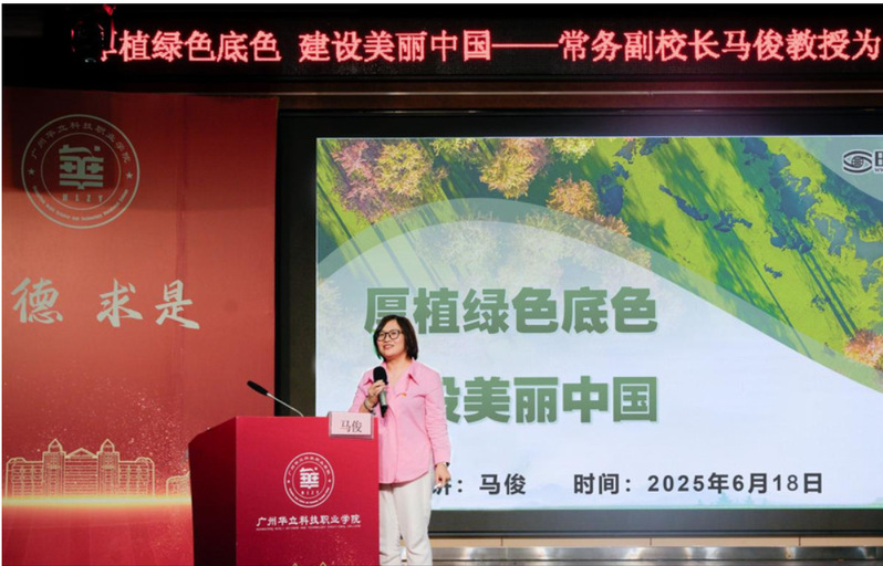 為深入貫徹落實(shí)習(xí)近平生態(tài)文明思想,2025年6月18日晚上6點(diǎn)在圖書(shū)館八樓禮堂,廣州華立科技職業(yè)學(xué)院常務(wù)副校長(zhǎng)馬俊教授以“厚植綠色底色 建設(shè)美麗中國(guó)”為主題,為藝術(shù)與傳媒學(xué)院師生帶來(lái)了一堂別開(kāi)生面、意義深遠(yuǎn)的思政課。參加此次思政課的有藝傳學(xué)院院長(zhǎng)朱君、全體輔導(dǎo)員、專業(yè)老師以及23級(jí)400左右學(xué)生,藝傳學(xué)院黨總支書(shū)記陳改梅主持。