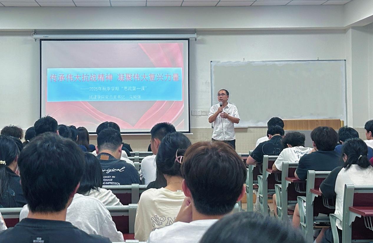 2025年10月14日,城建學(xué)院黨總支書記吳毅強在第二教學(xué)樓408教室,為24級、25級各專業(yè)學(xué)生代表講授主題為“傳承偉大抗戰(zhàn)精神 凝聚偉大復(fù)興力量”的“思政第一課”,引導(dǎo)青年學(xué)子從抗戰(zhàn)歷史中汲取精神力量,錨定民族復(fù)興使命。