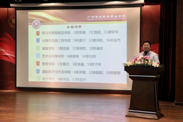 出席本次競選大會的評委老師有:廣州華立科技職業(yè)學(xué)院高堯來副校長、學(xué)生處處長曾祥彪老師、團委書記朱君老師、教務(wù)科科長王澤秀老師、生活指導(dǎo)科副科長謝菲老師。
