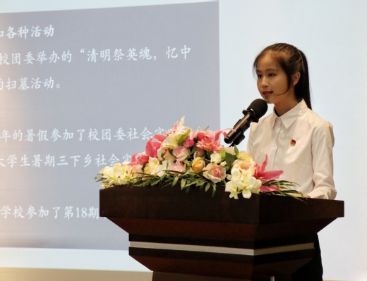 接著選手們用PPT上臺演講,從品德、學(xué)業(yè)、社會實踐、個人突出表現(xiàn)等方面介紹個人成績,并由評委老師們提問的方式進行評選。經(jīng)過選手們激烈的競爭,競選進入評選階段。