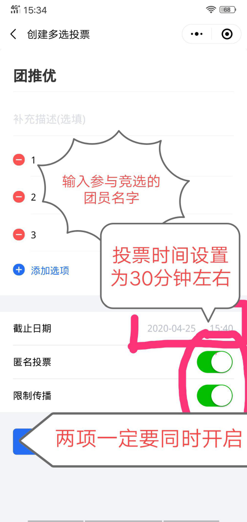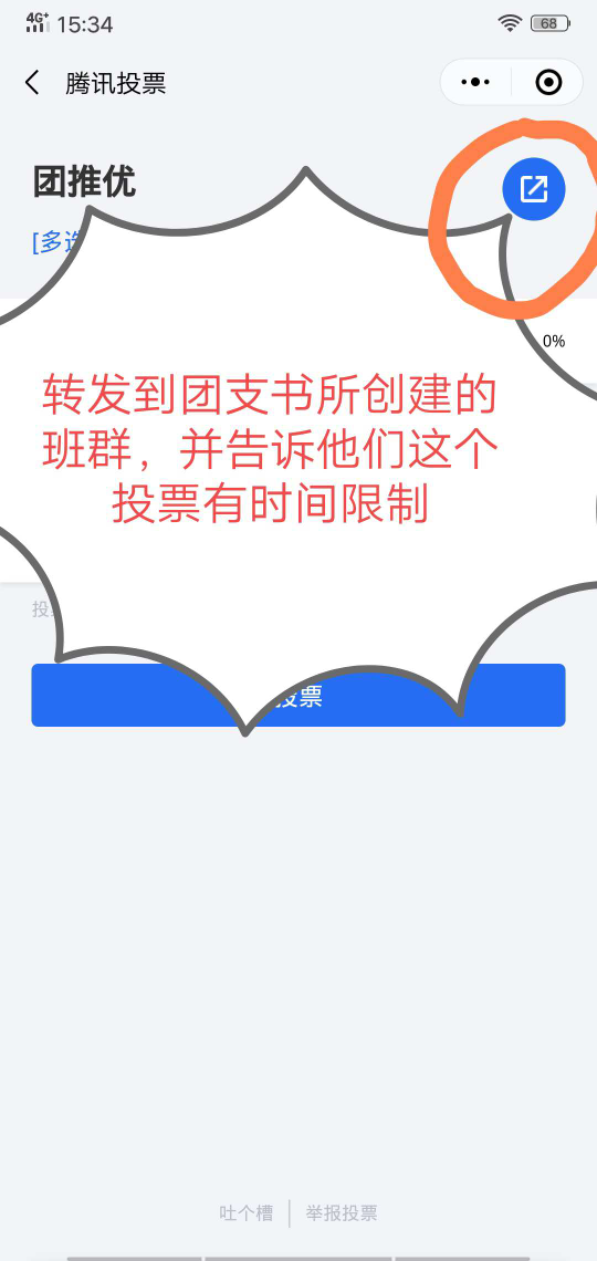 (3)與會團員對符合“團推優(yōu)”條件的團員進行線上民主評議并用微信小程序騰訊投票進行投票并且由投票發(fā)起人截圖唱票;(詳細投票過程請根據(jù)附件四進行)