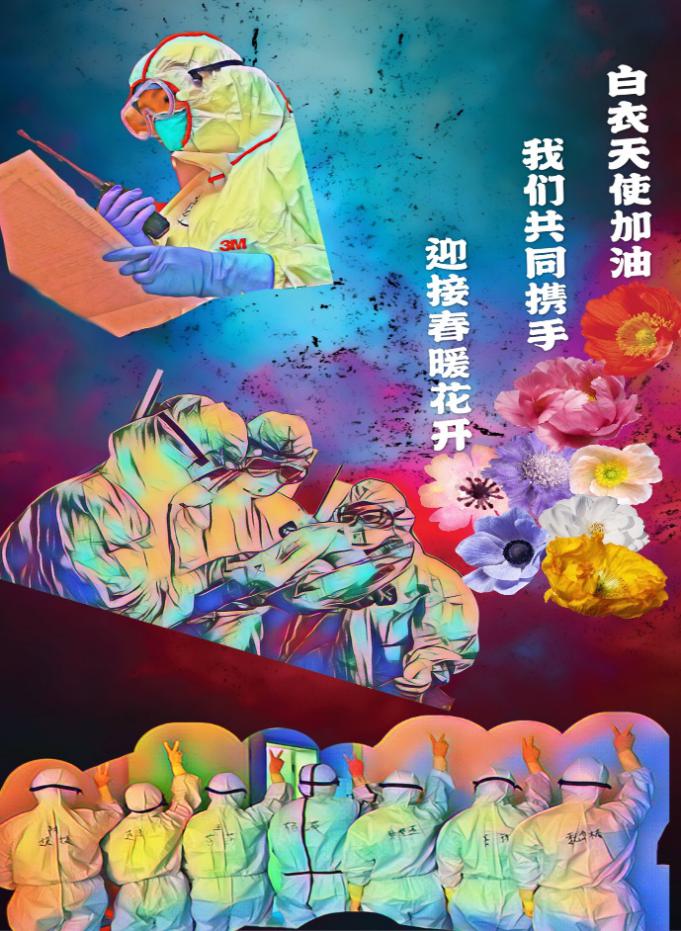 社會(公益)海報是帶有一定思想性的,它具有特定的主題和對公眾的教育意義。在這批海報創(chuàng)作中,我們看到,一方面是近期教師網(wǎng)課教學(xué)與學(xué)生學(xué)習(xí)成果的匯報,另一方面是通過“抗疫”主題創(chuàng)作來鼓舞斗志、撫慰心靈、凝聚人心,展示“藝”起戰(zhàn)疫,“傳”愛迎春的精神力量。