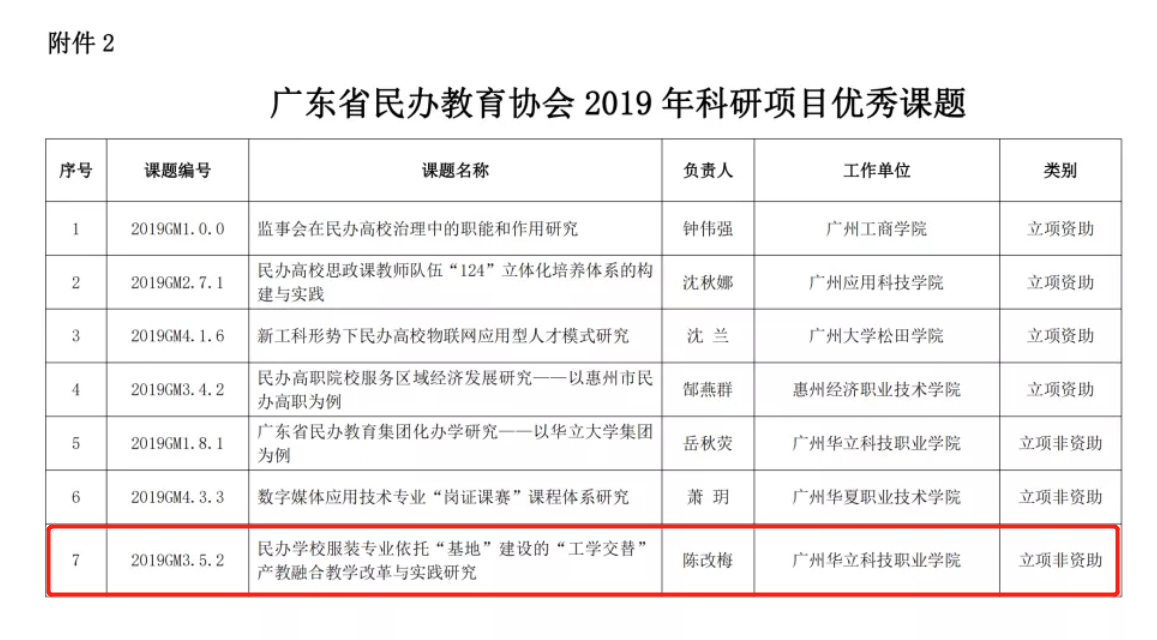 根據(jù)《廣東省民辦教育協(xié)會關于開展2019年度科研項目結題驗收工作的通知》(粵民教協(xié)〔2019〕6號),廣東省民辦教育協(xié)會組織專家開展了結題驗收工作,經專家組審核評定,我院陳改梅老師的課題《民辦學校服裝專業(yè)依托“基地”建設的“工學交替”產教融合教學改革與實踐研究》(課題編號:2019GM3.5.2)順利通過驗收,課題被評選為廣東省民辦教育協(xié)會省級優(yōu)秀課題。