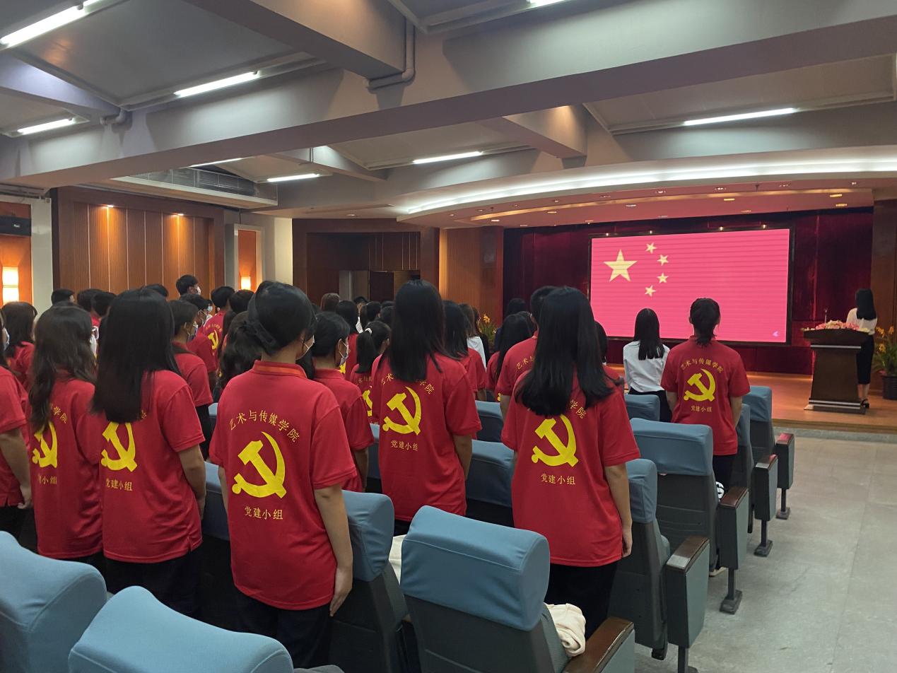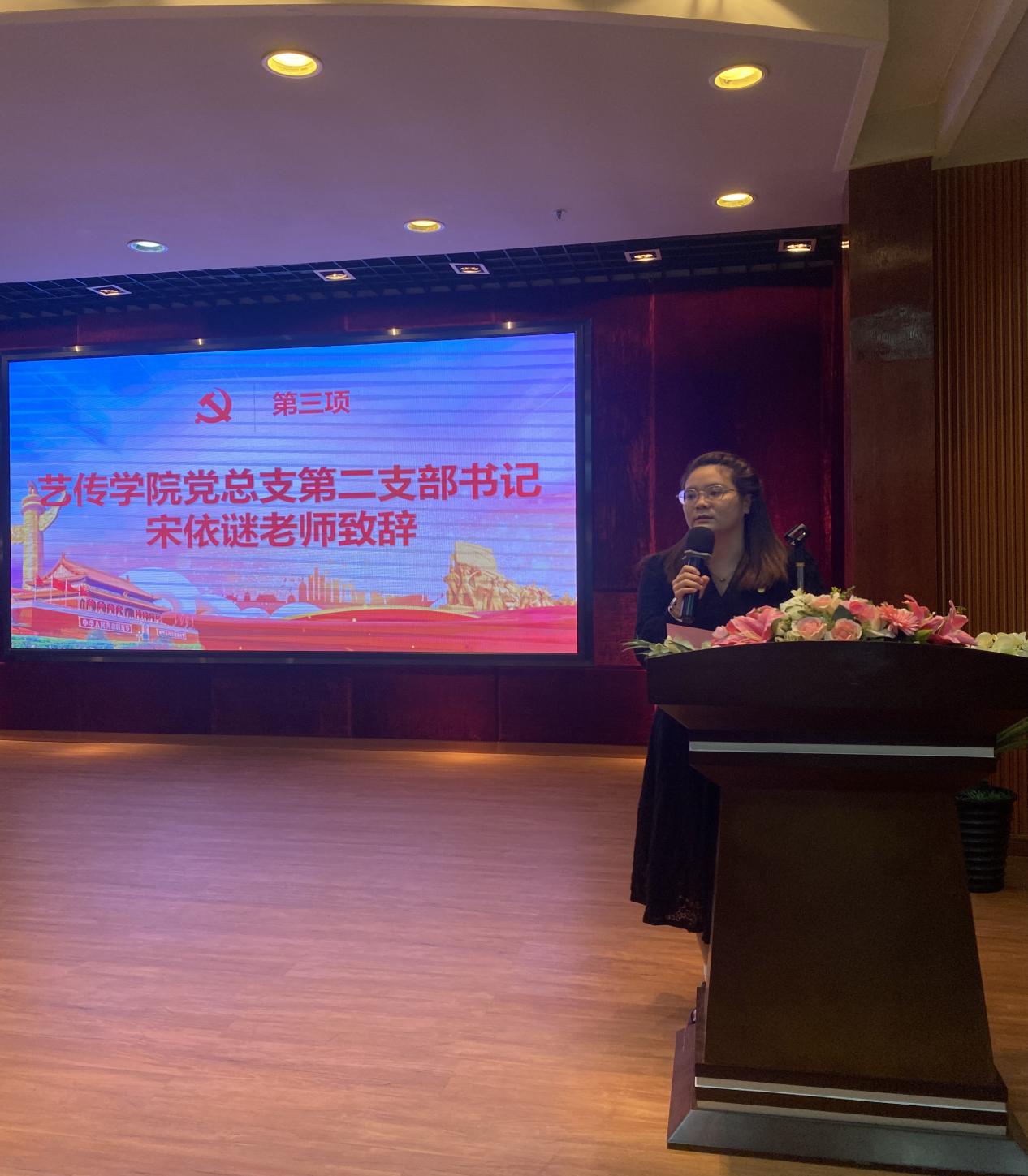 國歌奏唱完畢,藝傳學院黨總支第二黨支部書記宋依謎上臺致詞。她強調(diào),人的一生要有信仰,黨的方針、黨的思想我們要去追求;習近平總書記所講到的每一個字眼每一句話,我們都要認真去學習,包括在未來的日子里在座的各位都要學會如何去學習!她希望同學們能在工作中承擔起一份責任,將黨建工作做得更好,成為藝傳學院的一道風景。