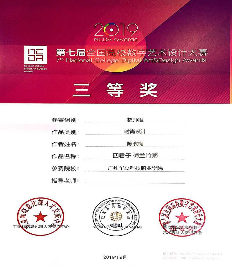 2019年陳改梅老師作品四君子 梅蘭竹菊榮獲第七屆全國高校數(shù)字藝術(shù)設(shè)計大賽三等獎
