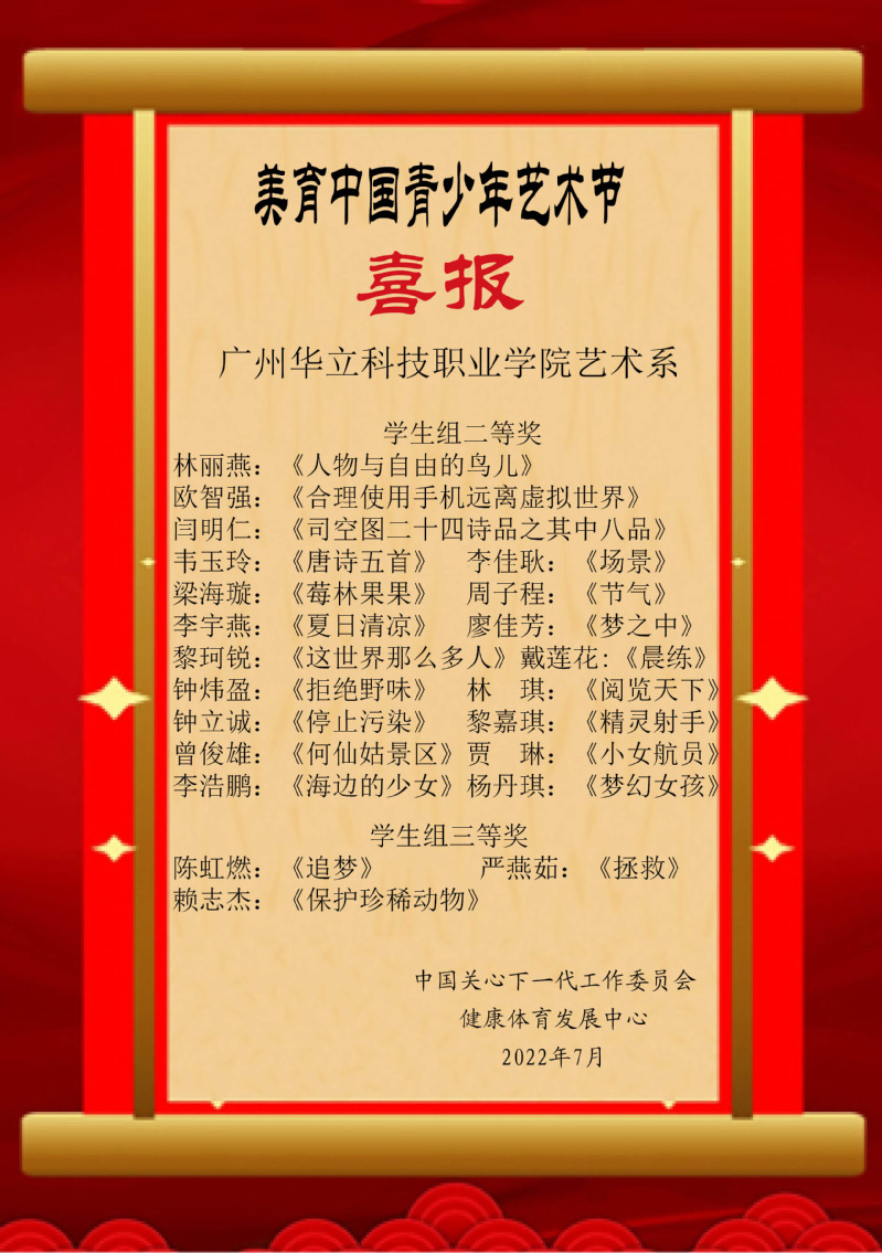 由中國關(guān)心下一代工作委員會(huì)舉辦的全國“美育青少年藝術(shù)節(jié)高校作品大賽”比賽活動(dòng)中,我院師生獲得優(yōu)異成績。在本次大賽活動(dòng)中,我院陳改梅、鄧常寧、李桂林、黎映如、姜兵、陳舒薇老師獲得優(yōu)秀指導(dǎo)老師獎(jiǎng),鄧常寧老師獲得優(yōu)秀組織獎(jiǎng)。以上老師分別榮獲教師組一、二等獎(jiǎng),我院有25名學(xué)生獲得優(yōu)異成績。