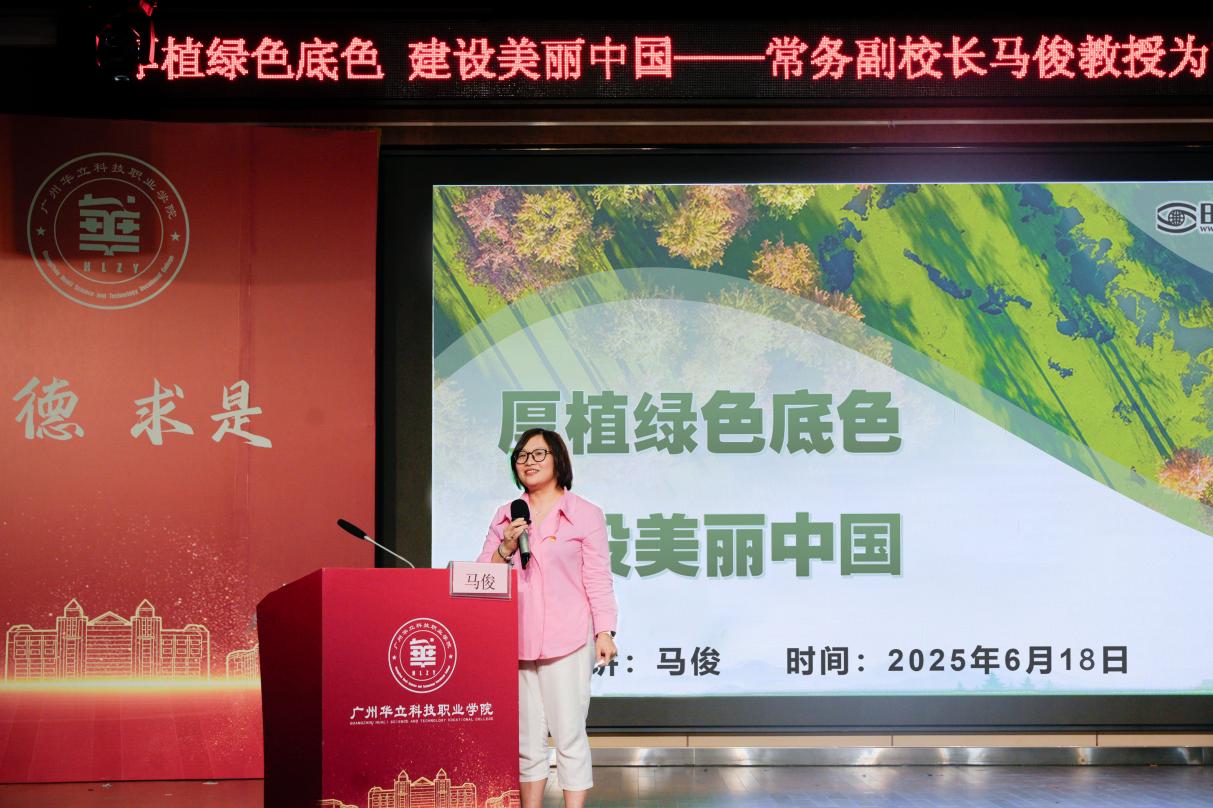 為深入貫徹落實習近平生態(tài)文明思想,2025年6月18日晚上6點在圖書館八樓禮堂,廣州華立科技職業(yè)學院常務副校長馬俊教授以“厚植綠色底色 建設美麗中國”為主題,為藝術與傳媒學院師生帶來了一堂別開生面、意義深遠的思政課。參加此次思政課的有藝傳學院院長朱君、全體輔導員、專業(yè)老師以及23級400左右學生,藝傳學院黨總支書記陳改梅主持。
