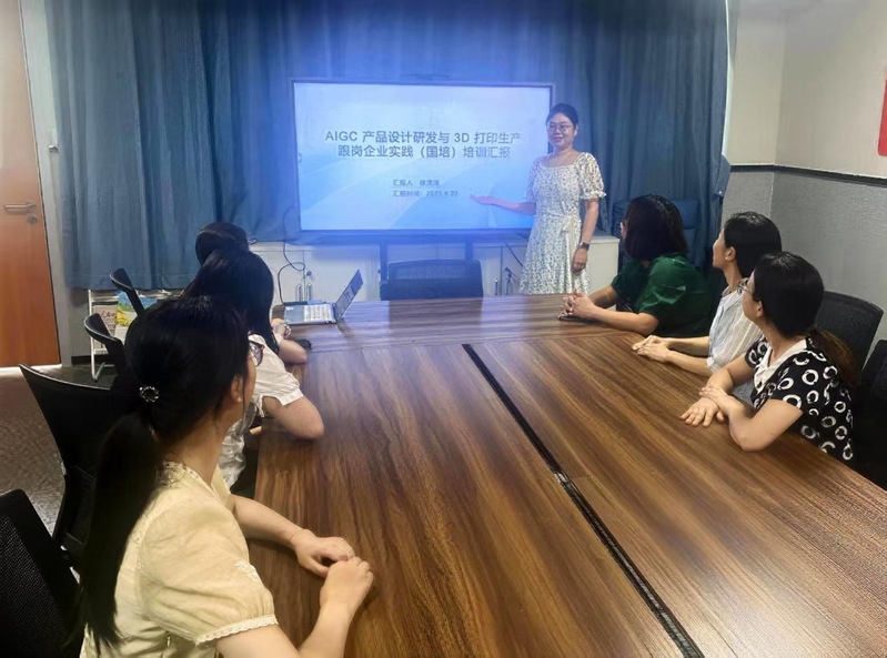 徐溧澤老師則分享了參加廣東工貿(mào)職業(yè)技術(shù)學(xué)院主辦的“AIGC產(chǎn)品設(shè)計(jì)研發(fā)與3D打印生產(chǎn)跟崗企業(yè)實(shí)踐”項(xiàng)目的收獲。該項(xiàng)目歷時(shí)28天,首周在校內(nèi)完成3D打印理論與實(shí)操培訓(xùn),后三周進(jìn)入廣東東方麥田工業(yè)設(shè)計(jì)股份有限公司,以企業(yè)實(shí)際項(xiàng)目為依托開展產(chǎn)品設(shè)計(jì)全流程實(shí)踐。作為組長,徐老師帶領(lǐng)團(tuán)隊(duì)完成了系列榨汁杯的產(chǎn)品開發(fā)任務(wù),完整參與從市場調(diào)研、概念構(gòu)思、工業(yè)建模、效果圖制作到工廠打樣與模型展示的全部環(huán)節(jié),其出色的組織與設(shè)計(jì)能力獲得企業(yè)認(rèn)可,被評為“優(yōu)秀學(xué)員”。會(huì)上,她還展示了多件個(gè)人3D打印作品,體現(xiàn)出扎實(shí)的技術(shù)功底與持續(xù)的創(chuàng)新探索。