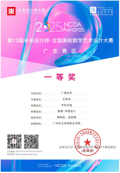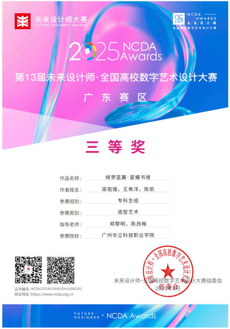 在2025年舉辦的第13屆未來設(shè)計(jì)師·全國高校數(shù)字藝術(shù)設(shè)計(jì)大賽(NCDA)中,藝術(shù)與傳媒學(xué)院師生憑借其卓越的創(chuàng)意和精湛的技術(shù),榮獲多項(xiàng)大獎(jiǎng)。未來設(shè)計(jì)師·全國高校數(shù)字藝術(shù)設(shè)計(jì)大賽(NCDA)是入選《全國普通高校大學(xué)生競賽排行榜》,近20家省教育廳認(rèn)定,“學(xué)習(xí)強(qiáng)國”學(xué)習(xí)平臺支持,對接聯(lián)合國國際賽的全國性大學(xué)生競賽。是高校教育教學(xué)改革和創(chuàng)新人才培養(yǎng)的重要競賽項(xiàng)目之一,具有極高的知名度與影響力。本次大賽是由全國高校數(shù)字藝術(shù)設(shè)計(jì)專業(yè)委員會(huì)主辦,旨在挖掘和培養(yǎng)數(shù)字藝術(shù)設(shè)計(jì)領(lǐng)域的未來之星,大賽已連續(xù)舉辦13屆,為藝術(shù)設(shè)計(jì)領(lǐng)域的高水平知名賽事,是我院師生積極參與的重要專業(yè)競賽之一。