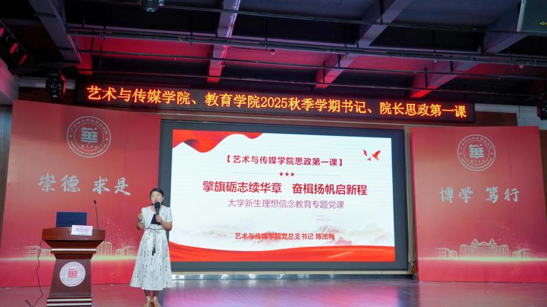 為引導(dǎo)和幫助青年學(xué)子學(xué)會(huì)用習(xí)近平新時(shí)代中國(guó)特色社會(huì)主義思想的先進(jìn)理論武裝頭腦,將個(gè)人成長(zhǎng)與民族復(fù)興緊密相連,扣好人生“第一??圩印保?月11日晚,藝術(shù)與傳媒學(xué)院黨總支書記陳改梅老師以 “擎旗礪志續(xù)華章 奮楫揚(yáng)帆啟新程”為主題,在圖書館八樓報(bào)告廳,為藝術(shù)與傳媒學(xué)院、教育學(xué)院新生帶來(lái)了情感觸動(dòng)強(qiáng)烈、思想啟迪深刻的“思政第一課”。學(xué)院院長(zhǎng)朱君、教師黨員和2025級(jí)新生參加聽(tīng)課。