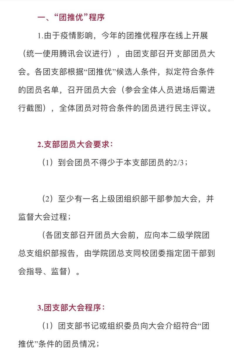 為貫徹中央關(guān)于新冠病毒感染的肺炎疫情防控的總體要求,全校師生實(shí)行停課不停學(xué)政策。線上發(fā)展中國(guó)共產(chǎn)主義青年團(tuán)是中國(guó)共產(chǎn)黨的助手和后備軍,推薦優(yōu)秀團(tuán)員作為黨的培養(yǎng)對(duì)象工作(以下簡(jiǎn)稱(chēng)“團(tuán)推優(yōu)”),是黨賦予共青團(tuán)組織的一項(xiàng)光榮任務(wù),也是充分發(fā)揮共青團(tuán)作為黨的助手和后備軍作用的重要措施。