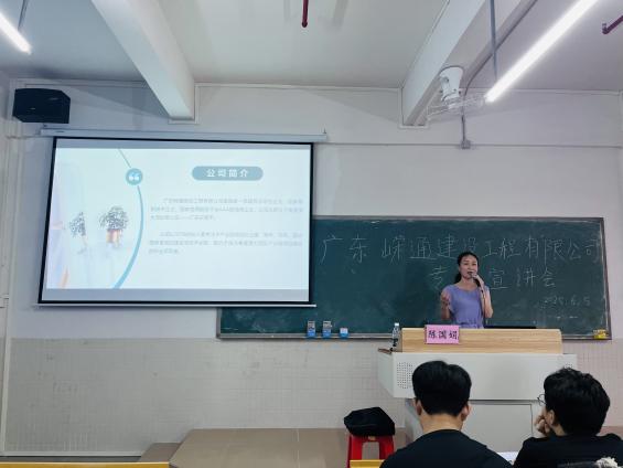 宣講會伊始,廣東嶸通建設有限公司陳國娟主任向同學們介紹了公司的基本情況,并引用我院近年來在該企業(yè)成功就業(yè)的案例,就公司的組織架構、企業(yè)文化、人才培養(yǎng)體系以及職業(yè)發(fā)展路徑進行詳細講解,公司注重實習學生的成長與發(fā)展,結合校內(nèi)課程在實習期間提供完善的培訓機制。