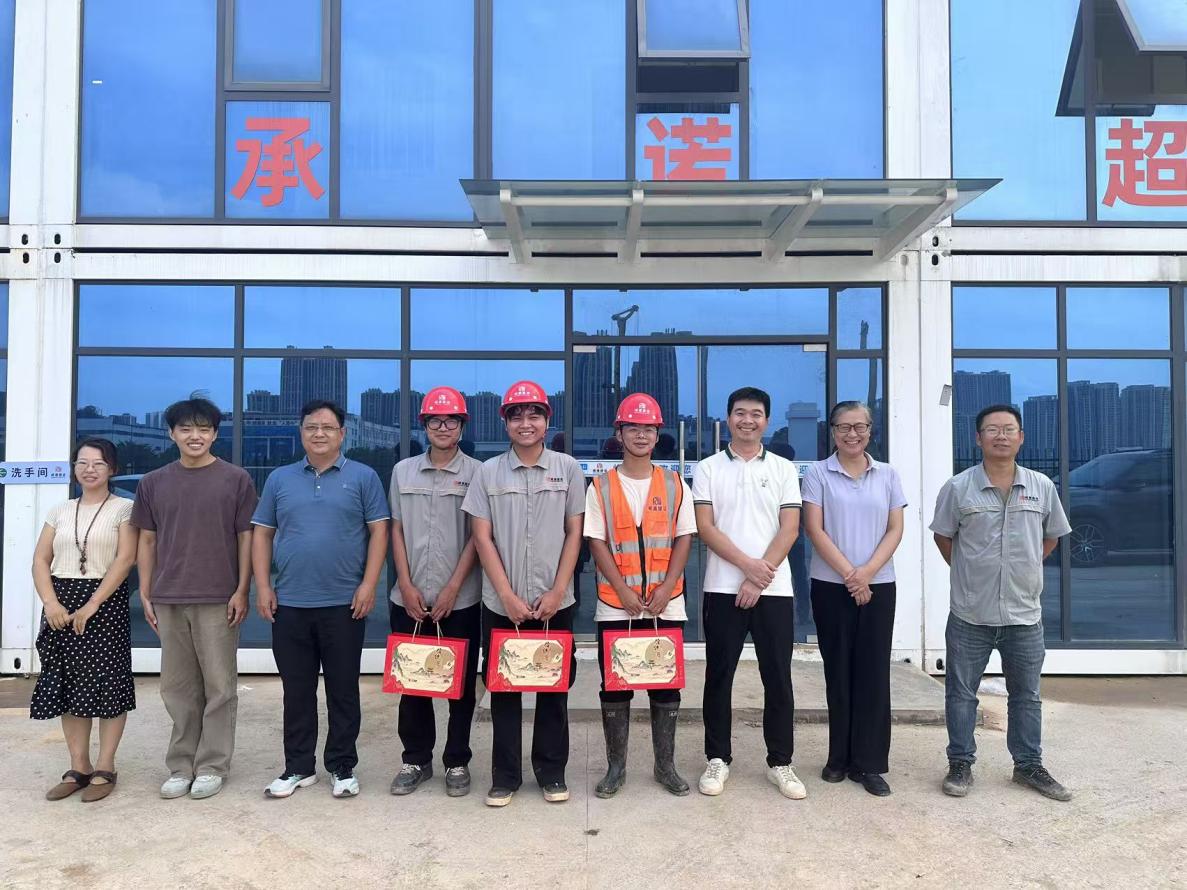 中秋佳節(jié)將至,為表達(dá)學(xué)校對實(shí)習(xí)學(xué)生的深切關(guān)懷與牽掛,深化產(chǎn)教融合、校企合作,根據(jù)學(xué)院統(tǒng)籌安排,2025年9月29日,廣州華立科技職業(yè)學(xué)院城建學(xué)院院長助理馬芳老師、教科研副主任喬亮老師、裝配式建筑工程技術(shù)專業(yè)負(fù)責(zé)人楊艷老師、建筑工程技術(shù)專業(yè)負(fù)責(zé)人鄭建勛老師一行趕赴廣東嶸通建設(shè)有限公司開展校企合作簽約儀式、巡回教學(xué)活動,并親切看望慰問在崗實(shí)習(xí)的學(xué)生,為他們送上中秋禮品與節(jié)日祝福。