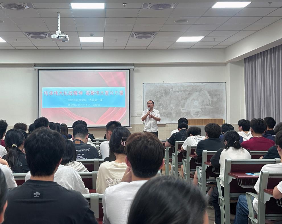 2025年10月14日,城建學(xué)院黨總支書記吳毅強(qiáng)在第二教學(xué)樓408教室,為24級、25級各專業(yè)學(xué)生講授以“傳承偉大抗戰(zhàn)精神 凝聚偉大復(fù)興力量”為主題的“思政第一課”,引導(dǎo)青年學(xué)子從抗戰(zhàn)歷史中汲取精神力量,錨定民族復(fù)興使命。