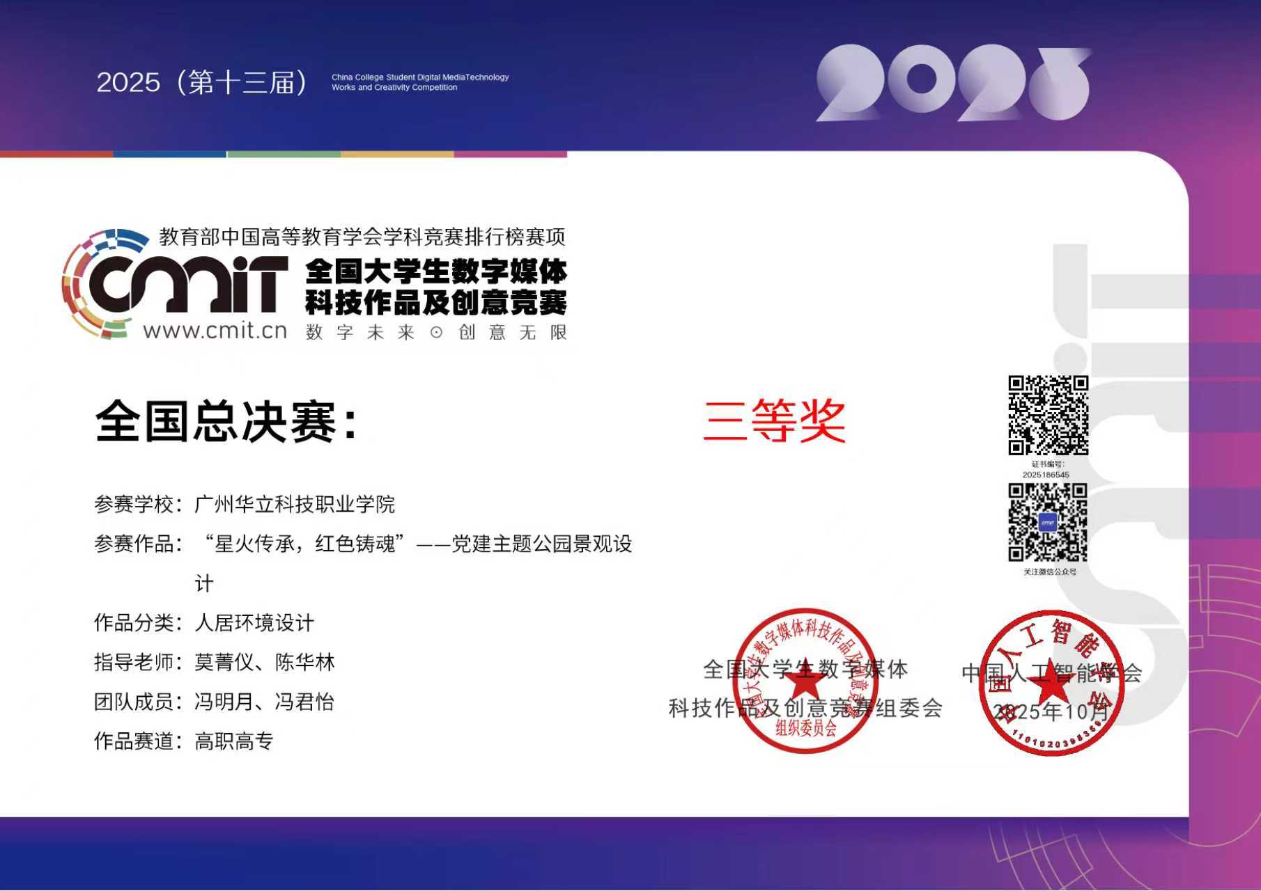 其中,由程若愚、莫菁儀、陳華林老師指導(dǎo),陳佳怡、馮明月等同學(xué)完成的作品《嶼光別院-鄉(xiāng)村民宿設(shè)計》、《星火傳承,紅色鑄魂”--黨建主題公園景觀設(shè)計》在全國大學(xué)生數(shù)字媒體科技作品及創(chuàng)意競賽全國總決賽中榮獲三等獎2項,廣東賽區(qū)中獲二等獎2項;由田婭娟、莫菁儀、陳華林老師指導(dǎo),何穎詩、馮君怡等同學(xué)完成作品《池上幽居靜寄山莊池上居復(fù)原與改造設(shè)計》、《“廬州軌跡”--道路節(jié)點綠化景觀工程恢復(fù)設(shè)計》榮獲廣東賽區(qū)三等獎2項。