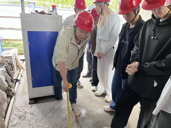 在工地區(qū)域,項目技術(shù)負責(zé)人李進鵬詳細講解模板流轉(zhuǎn)使用、塔吊布設(shè)注意事項、混凝土試塊養(yǎng)護設(shè)備操作規(guī)范等實踐知識。針對學(xué)生提出的銹蝕鋼筋處理、腳手架管件存放、塑料管材存儲要求等問題,李工結(jié)合工程實例逐一解答,讓學(xué)生直觀感受建筑施工 “高效、環(huán)保、質(zhì)量可控”的優(yōu)勢。