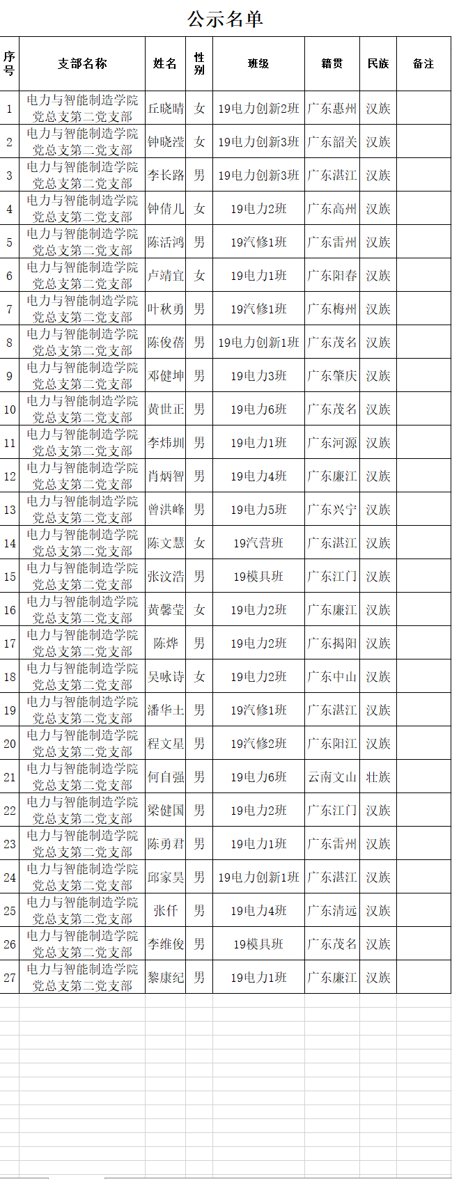 根據(jù)廣州華立科技職業(yè)學院黨委發(fā)展新黨員的要求,由學生本人提出申請,經(jīng)電力與智能制造學院黨總支第二黨支部培養(yǎng)考察、民主推薦,黨總支審查,2021年4月25日預審討論決定將陳燁等27位同志列為近期預備黨員發(fā)展對象,總支將在近期召開黨員大會討論他們的入黨問題并上報黨委審核。為了進一步增強發(fā)展黨員的透明度,確保發(fā)展新黨員的質(zhì)量,根據(jù)《中國共產(chǎn)黨發(fā)展黨員工作細則(試行)》等文件的有關(guān)精神,現(xiàn)將發(fā)展對象的名單公示如下(具體名單見附件):