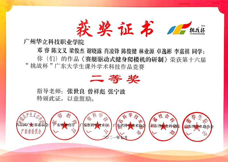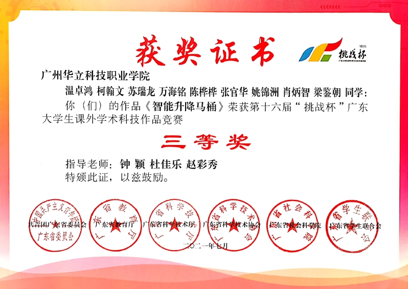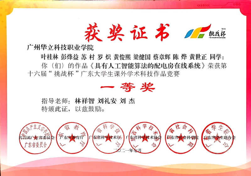 2021年7月,電力學院學子參加第十六屆“挑戰(zhàn)杯”廣東大學生課外學術科技作品競賽,共有4個團隊通過學校評審,經(jīng)過省專家網(wǎng)評,有2個項目入圍終審決賽。7月17日至18日,由省團委、省教育廳、省科技廳、省科協(xié)、省社科院、省學聯(lián)共同舉辦的第十六屆“挑戰(zhàn)杯”廣東大學生課外學術科技作品競賽終審決賽取得優(yōu)異成績。電力與智能制造學院學子不負眾望,共獲4個獎項,分別獲得一等獎1項,二等獎1項,三等獎2項。
