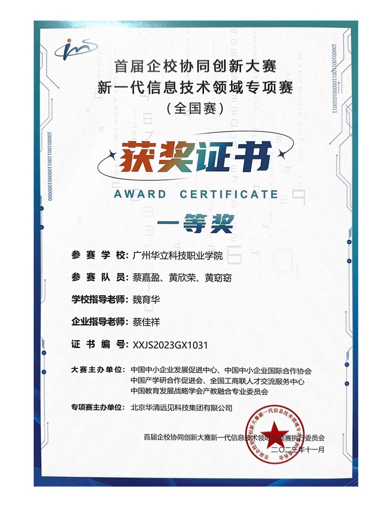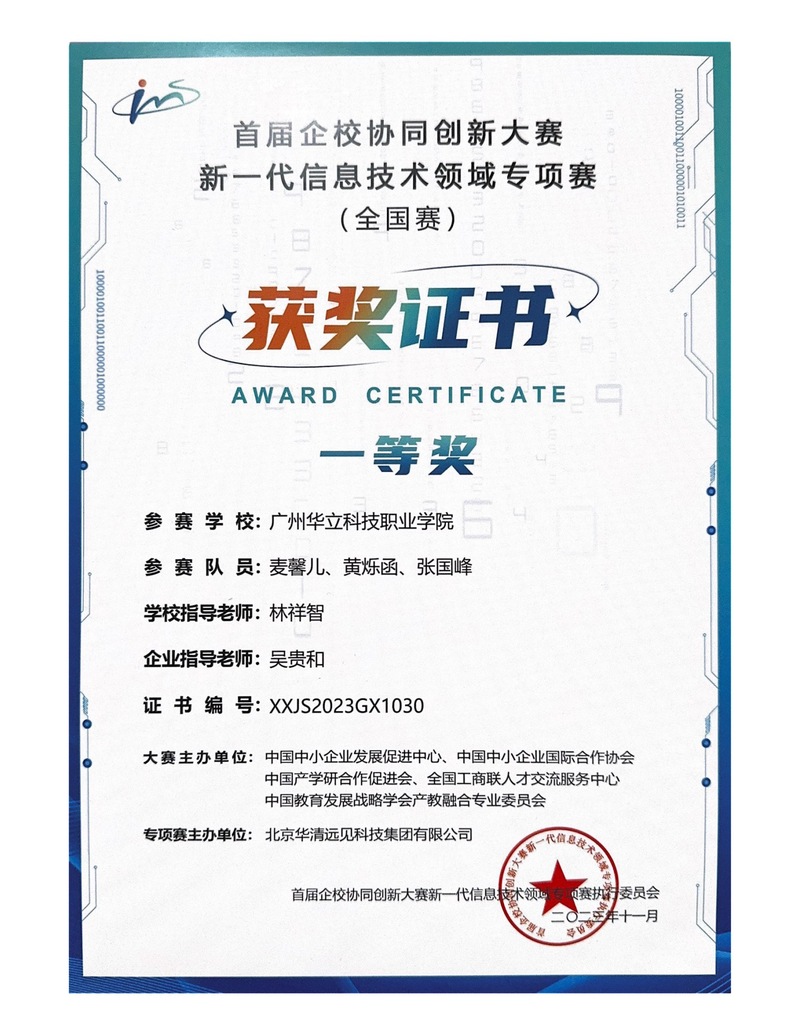 2023全國(guó)首屆企校協(xié)同創(chuàng)新大賽新一代信息技術(shù)領(lǐng)域?qū)m?xiàng)賽決賽,11月25日-26日在山東臨沂科技職業(yè)學(xué)院圓滿收官。本次大賽從初賽171所院校923支隊(duì)伍中經(jīng)過(guò)層層選拔脫穎而出的33支代表隊(duì)伍,從全國(guó)各地奔赴決賽現(xiàn)場(chǎng),參加專(zhuān)項(xiàng)賽前十強(qiáng)的角逐。我校選派電力與智能制造學(xué)院林祥智老師指導(dǎo)的麥馨兒、黃爍函、張國(guó)峰團(tuán)隊(duì)及計(jì)算機(jī)信息工程學(xué)院魏育華老師指導(dǎo)的蔡嘉盈、黃欣榮、黃窈窈團(tuán)隊(duì)參賽,經(jīng)過(guò)激烈角逐均獲全國(guó)賽一等獎(jiǎng),并榮獲“優(yōu)秀組織獎(jiǎng)”。林祥智老師指導(dǎo)的學(xué)生團(tuán)隊(duì)榮獲專(zhuān)項(xiàng)賽前十強(qiáng),將于12月份參加企校協(xié)同創(chuàng)新大賽全國(guó)總決賽。