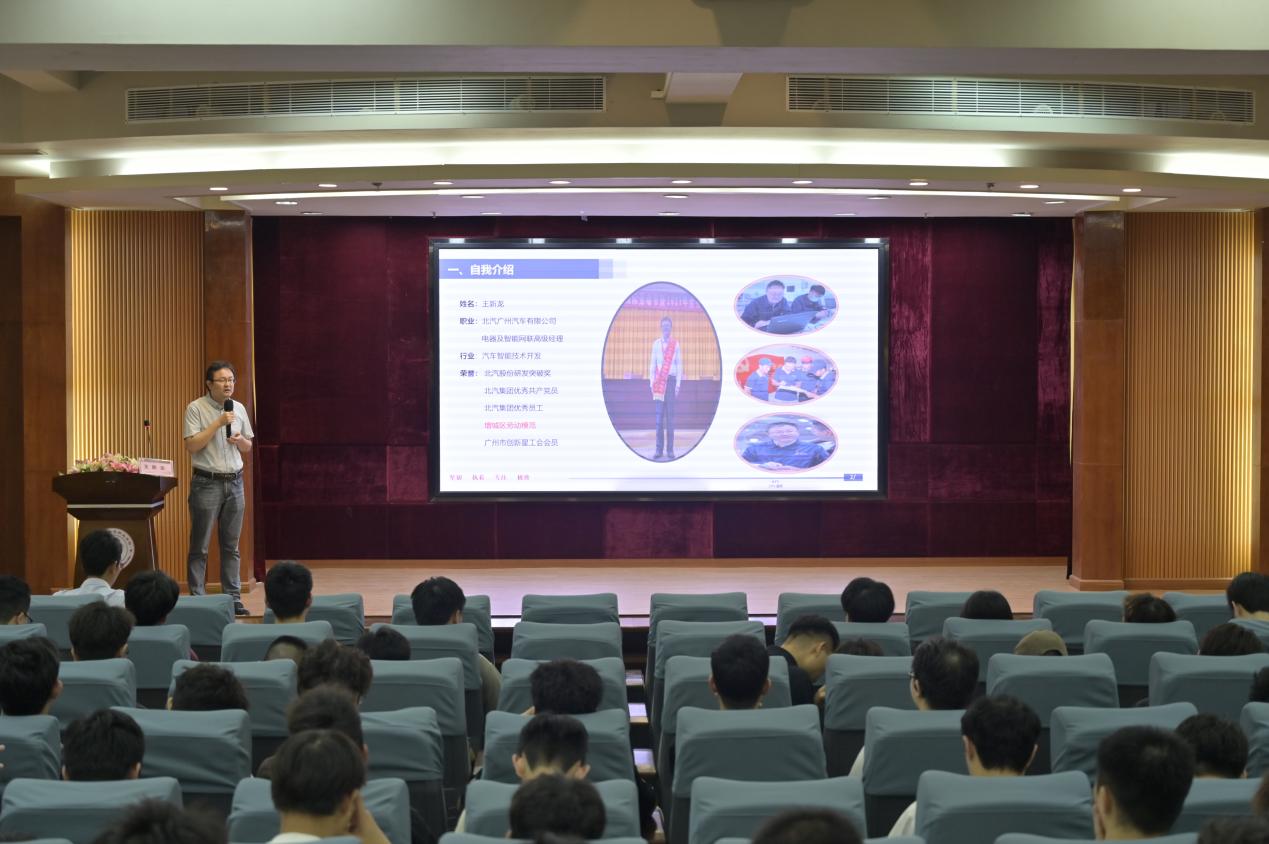 為貫徹落實黨的二十大精神,我校開展了以“技能:讓生活更美好”為主題的職業(yè)教育周暨勞動教育月活動,大力宣傳勞模精神、勞動精神、工匠精神,弘揚勞動光榮、技能寶貴、創(chuàng)造偉大的時代風尚,不斷推進職業(yè)教育高質(zhì)量發(fā)展。電力與智能制造學院于5月30日在圖書館1號報告廳舉辦“弘揚勞模精神、發(fā)展新質(zhì)生產(chǎn)力、讓生活更美好”專家講座,電力與智能制造學院汽車系學生和專業(yè)教師參加該講座。本次講座邀請了增城區(qū)勞動模范、北汽股份研發(fā)突破獎獲得者、北汽廣州汽車有限公司電器及智能網(wǎng)聯(lián)高級經(jīng)理王新龍。