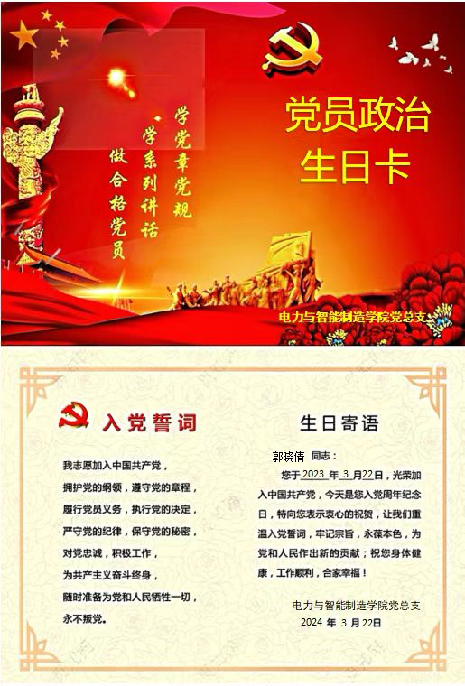 作為電力與智能制造學院教師黨員郭曉倩,3月22日早上,收到了學院黨組織發(fā)的“政治生日”賀卡,心情特別興奮,2023年3月22日是我光榮加入中國共產(chǎn)黨的日子。