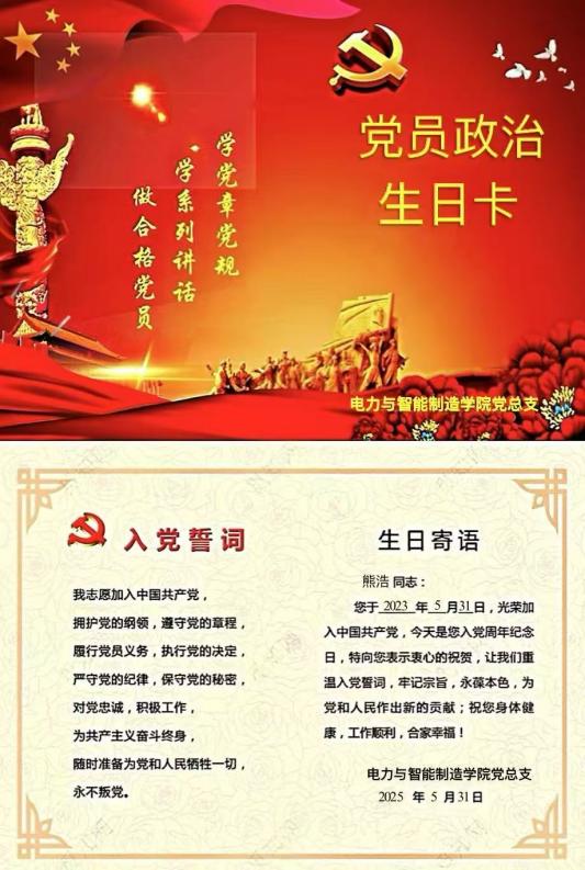 作為電力與智能制造學(xué)院云浮校區(qū)的一名教師黨員熊浩,2025年5月31日收到學(xué)院黨組織發(fā)的“政治生日”賀卡,我滿心歡喜,更懷著對(duì)組織深切關(guān)懷的感恩之情,迎來(lái)政治生日這一極具紀(jì)念意義的時(shí)刻——5月31日。于我而言,政治生日承載著對(duì)黨無(wú)限忠誠(chéng)與堅(jiān)定信念的莊重宣示?;厥淄?,入黨時(shí)那火紅黨旗的鮮艷色彩,早已深深烙印在我內(nèi)心深處,成為永不褪色的精神底色;而那莊嚴(yán)的入黨誓詞,每一個(gè)字、每一句話,都已融入我的靈魂,化作前行的不竭動(dòng)力。這力量,賦予鋼鐵般的黨性意志,讓我在黨的事業(yè)征程中,無(wú)畏艱難險(xiǎn)阻,勇往直前。我愿將拼搏與奉獻(xiàn)當(dāng)作最質(zhì)樸的行動(dòng)語(yǔ)言,在黨的工作中傾盡心力,不求回報(bào),只盼為黨和人民的事業(yè)添磚加瓦,用一生踐行入黨時(shí)的錚錚誓言,不負(fù)組織的培養(yǎng)與期望。