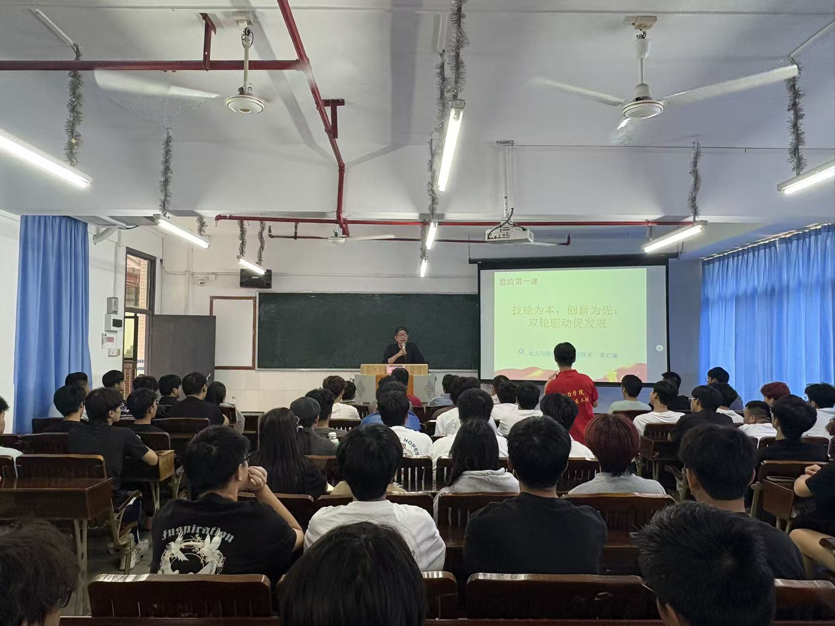 根據(jù)學(xué)校黨委的安排部署,電力與智能制造學(xué)院黨總支在西一教學(xué)樓303課室組織開展“思政第一課”。本次課程以“技能為本、創(chuàng)新為先:雙輪驅(qū)動(dòng)促發(fā)展”為題目,由學(xué)院梁仁建院長(zhǎng)主講,學(xué)院副院長(zhǎng)孫令真、學(xué)院團(tuán)委書記王明偉老師和學(xué)院24級(jí)學(xué)生代表及25級(jí)新生代表共同參與學(xué)習(xí)。