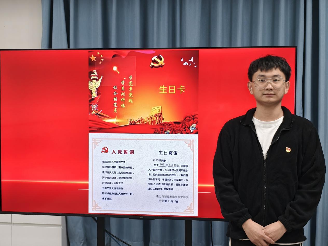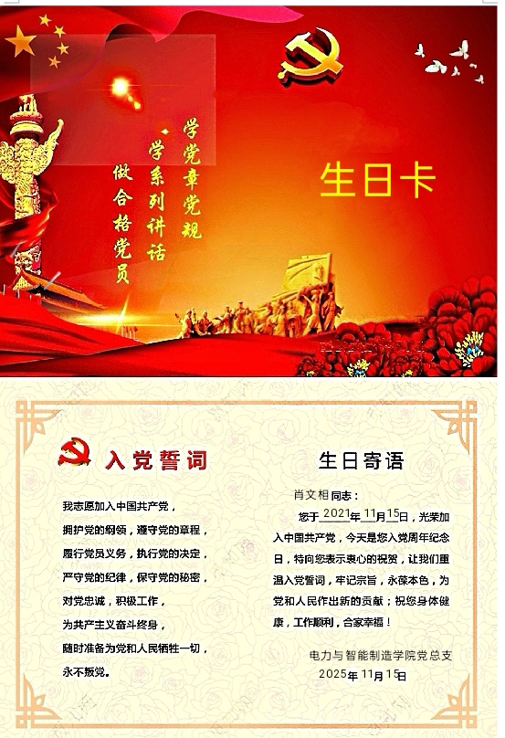 作為電力與智能制造學(xué)院的一名教師黨員肖文相,11月15日在收到學(xué)院黨組織發(fā)來的“政治生日”賀卡,我的心情格外激動,感謝組織的關(guān)懷。時(shí)間飛逝,轉(zhuǎn)眼間加入中國共產(chǎn)黨已經(jīng)4年。