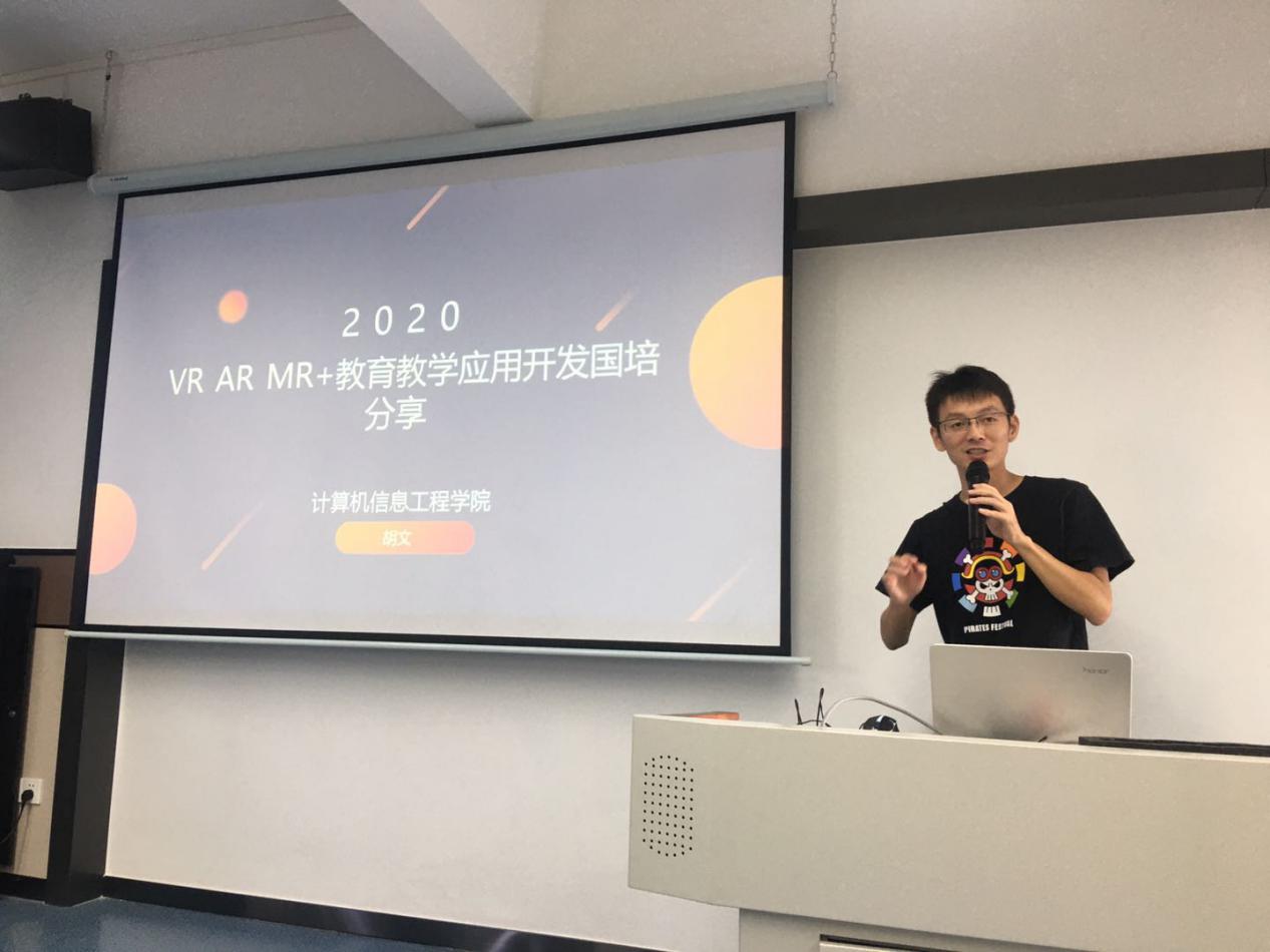 胡文老師向我們簡(jiǎn)述了什么是VR AR MR,VR的發(fā)展歷程、VR的3特性,對(duì)VR的發(fā)展前景以及對(duì)VR的現(xiàn)狀進(jìn)行了一系列的簡(jiǎn)述介紹,還向我們展現(xiàn)了在培訓(xùn)期間所用VR技術(shù)拍攝的視頻和自己用VR技術(shù)做的一款小游戲。