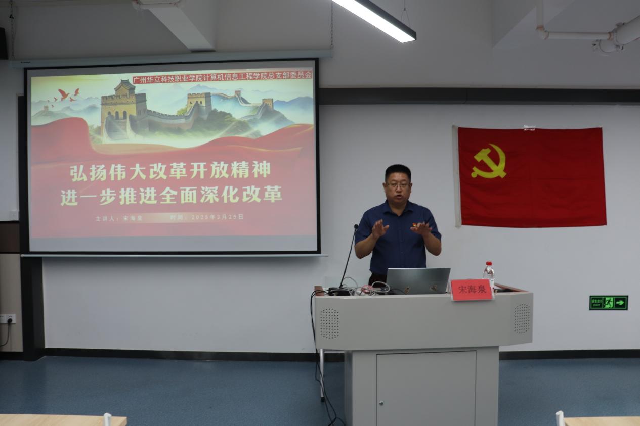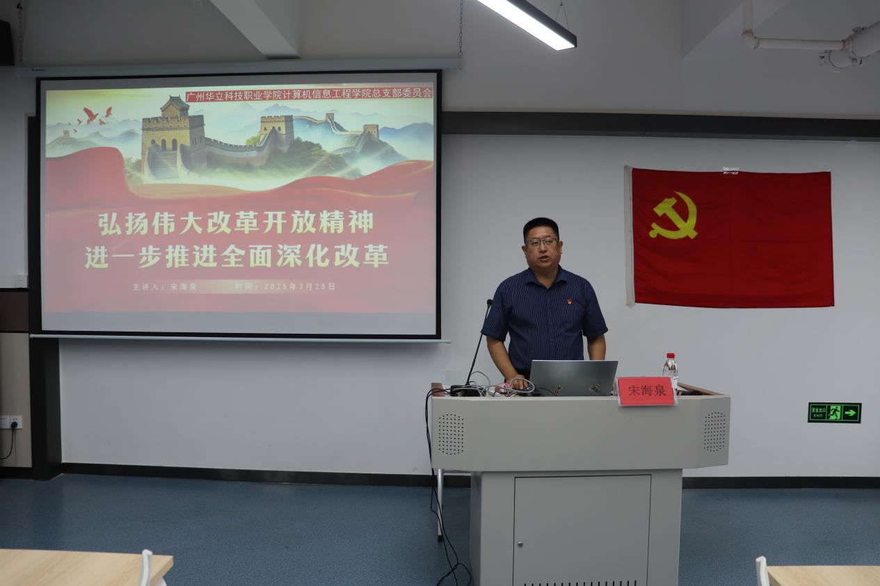 為引導(dǎo)同學(xué)們深入學(xué)習(xí)貫徹黨的二十屆三中全會(huì)精神,深刻理解改革開放精神的內(nèi)涵,激發(fā)大家在新時(shí)代為全面深化改革貢獻(xiàn)力量的熱情,2025年3月25日下午,計(jì)算機(jī)信息工程學(xué)院黨總支書記、副院長宋海泉以“弘揚(yáng)偉大改革開放精神-進(jìn)一步推進(jìn)全面深化改革”為主題為計(jì)算機(jī)信息工程學(xué)院學(xué)生講授“思政第一課”。
