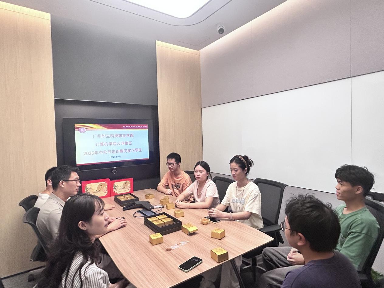 當日下午,黃院助一行來到元時空智能科技有限公司,親切看望了正在這里實習的2023級學生,為他們送上中秋月餅和節(jié)日的暖心祝福,并與學生代表座談。
